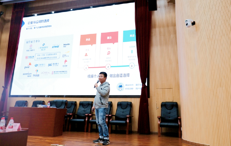 王帅则用诙谐幽默话语分享了该如何更好地度过研究生阶段。他认为,研究生生活短暂而又宝贵,如何平衡好学习与生活至关重要。他指出,“每个行业、每个公司都有选择的理由”,面对未来的职业选择,同学们要敢于逃离舒适圈,从自身出发结合兴趣,做出最适合自己的选择。