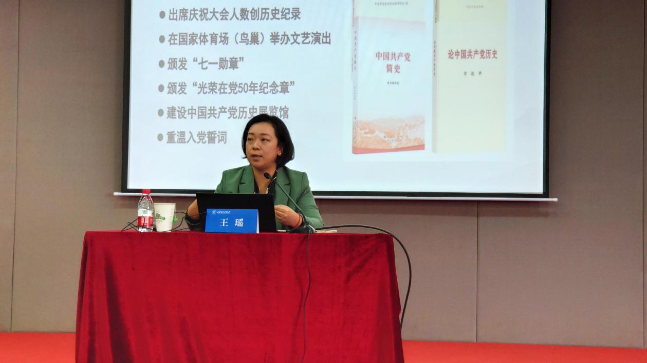 王瑶副教授从“一个奋斗主题”“四个伟大成就”“一个伟大精神”“九条基本经验”等方面阐释了习近平总书记“七一”重要讲话的重要意义和深刻内涵。她结合上海红色文化的诞生与发展史,从“初心始发地的真理追寻”“革命指挥地的使命担当”“浴血奋战地的忠诚为民”等三个方面深刻分析了伟大建党精神产生的历史文化渊源,回应了为什么共产党在上海诞生,以及历史为何选择了上海这座城市这一关键问题。报告主题鲜明、史料翔实、深入浅出,对学院广大师生党员进一步深入学习贯彻习近平总书记“七一”重要讲话精神,起到了重要的推动作用。