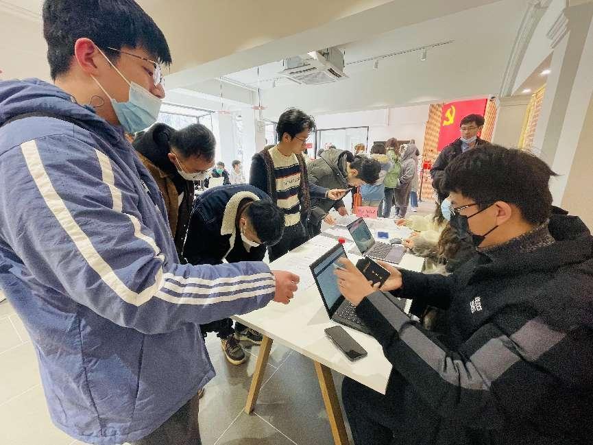 在松江学生社区85号楼理享家注册点,辅导员们热情接待每一位返校学生。学生排队办理系统注册、现场签到和学生证盖章手续,现场秩序井然。