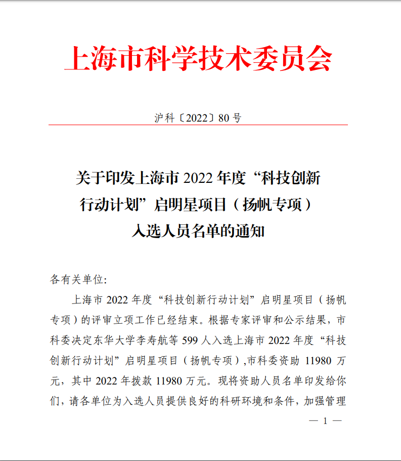 “科技创新行动计划”启明星项目(扬帆专项) 原名“扬帆计划”,是上海市科委为推进实施创新驱动发展战略,加快建设具有全球影响力的科技创新中心,加强上海科技人才队伍建设,培育优秀青年科技人才而设立的科技创新人才培育计划,主要面向在沪高校和科研院所等单位32周岁以下的在岗科研人员,旨在选拔和培养一批崭露头角的优秀青年科技人才,鼓励其进行原始创新和大胆探索,尽快成长为上海科技创新的中坚力量。