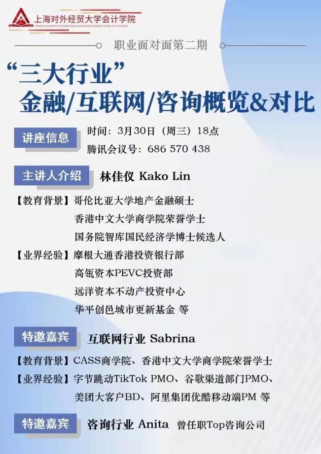 为明晰个人职业发展方向,了解当前金融、咨询、互联网三大行业情况,帮助同学们解答相关行业的各种疑惑,“会”咖职业生涯发展工作室特别邀请到三位行业中的“大咖”嘉宾,开展线上讲座与同学们交流分享她们的业界经验。