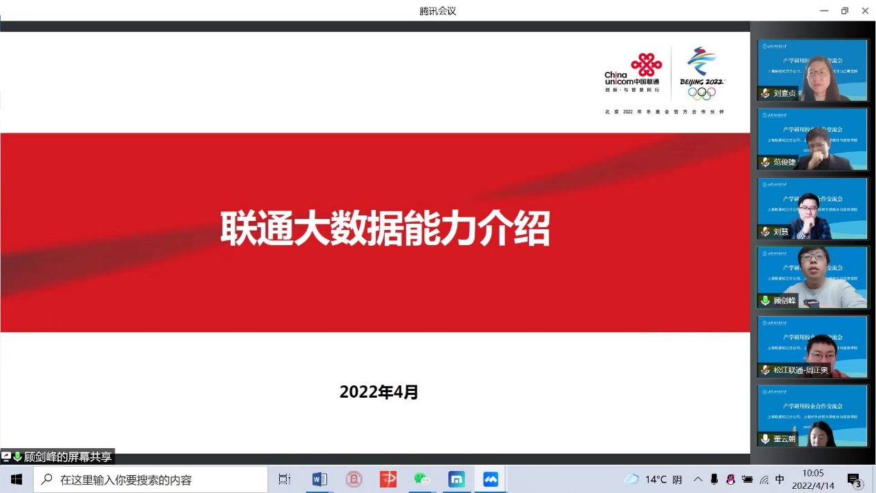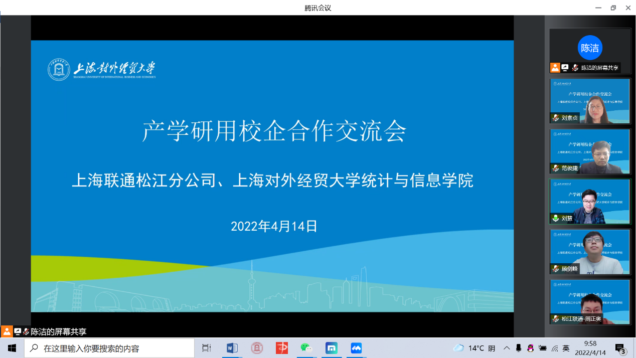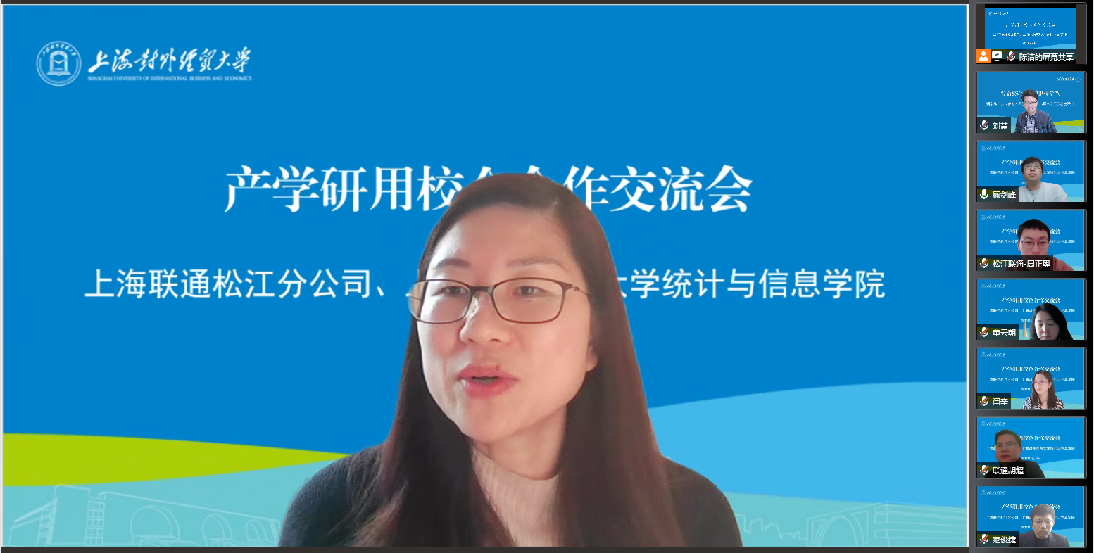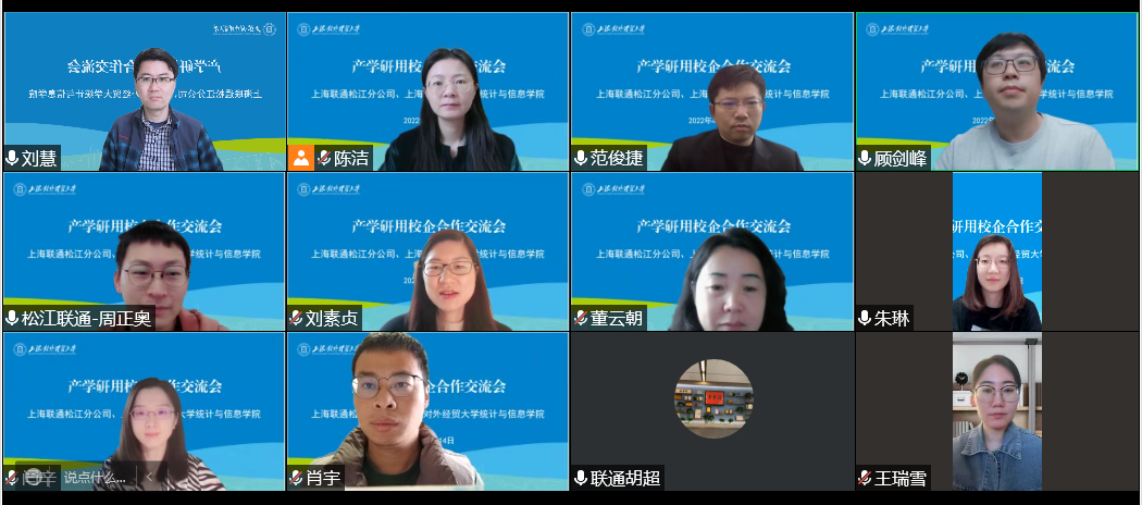 为加强校企产学研合作,4月14日上午,统计与信息学院与松江联通在线召开校企合作交流会,统计与信息学院党委副书记(主持工作)刘素贞、副院长刘慧、信息管理系系主任董云朝、副系主任肖宇、数据科学系教工党支部书记闫辛,松江联通副总经理范俊捷、上海联通专家代表顾剑峰、胡超、王瑞雪以及松江联通教育中心相关人员参加会议。会议由副院长刘慧主持。