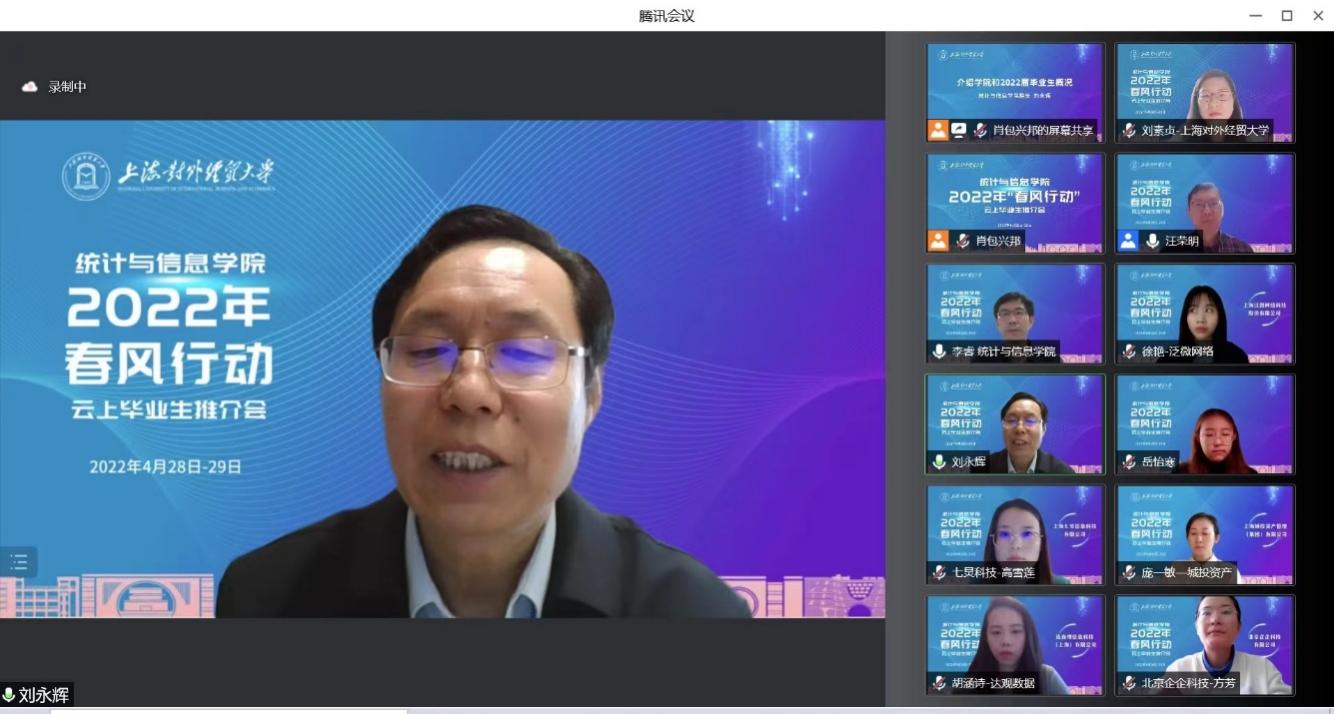 这是上海对外经贸大统计与信息学院推进实施的“春风行动”,为切实促进毕业生更充分、更高质量就业,积极搭建在校毕业生与用人单位精准供需对接的平台,于2022年4月起每周在线举办云上毕业生推介会。首场集中推介会于4月28日和29日两天滚动举行,吸引了埃森哲(中国)有限公司、上海投资咨询集团有限公司、上海泛微网络科技有限公司等15家用人单位,提供近60个就业岗位。25人初步达成了就业意向,约占招聘岗位的二分之一。