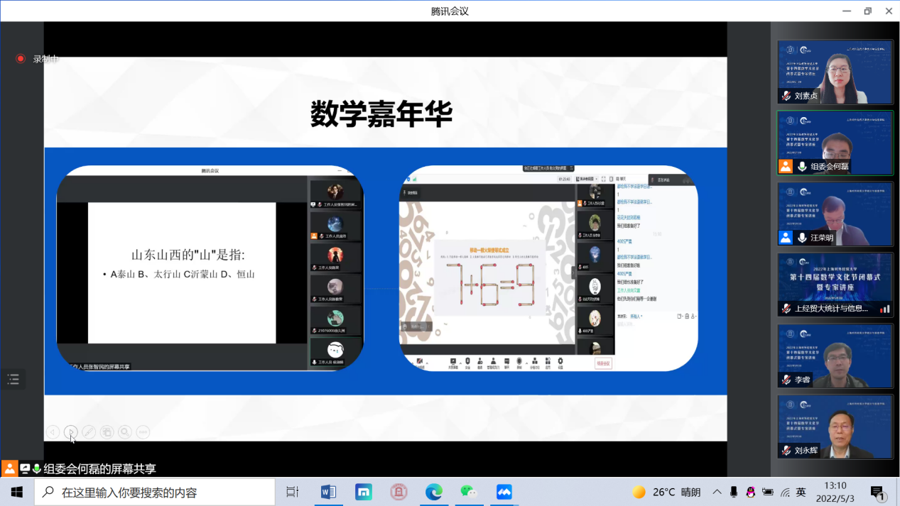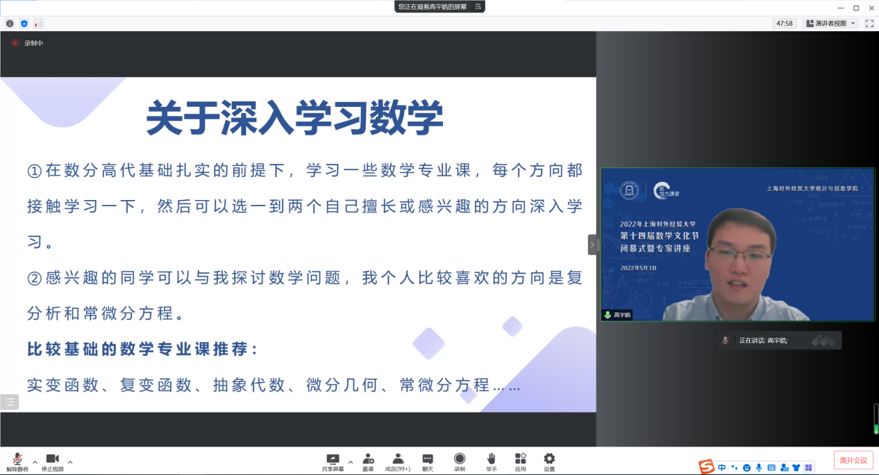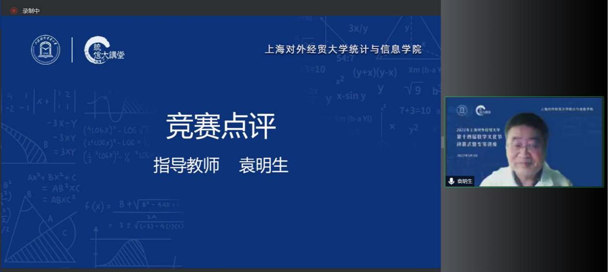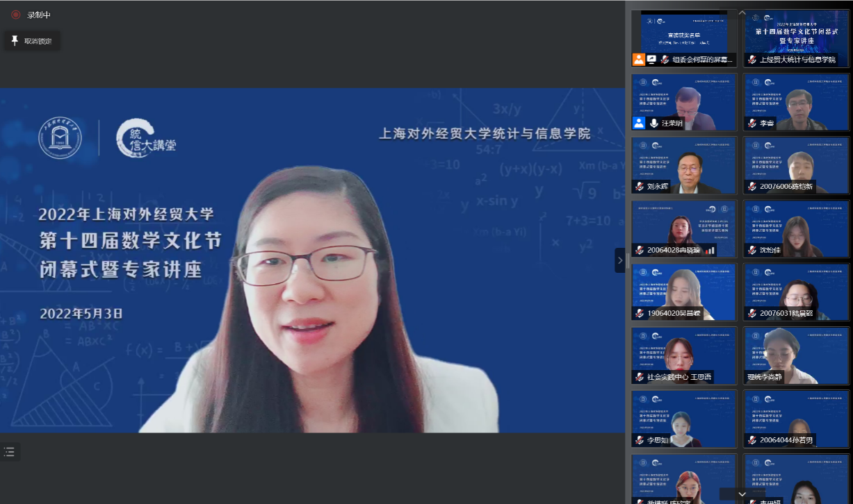 5月3日下午,上海对外经贸大学第十四届数学文化节闭幕式暨专家讲座在线举行,中国科学院院士严加安受邀以“概率破玄机,统计解迷离”为主题做讲座,上海对外经贸大学校长汪荣明出席活动并致辞,统计与信息学院原院长叶中行,统计与信息学院全体领导班子、教师代表和来自全校350余位数学爱好者相聚云端。闭幕式由统计与信息学院院长刘永辉主持。