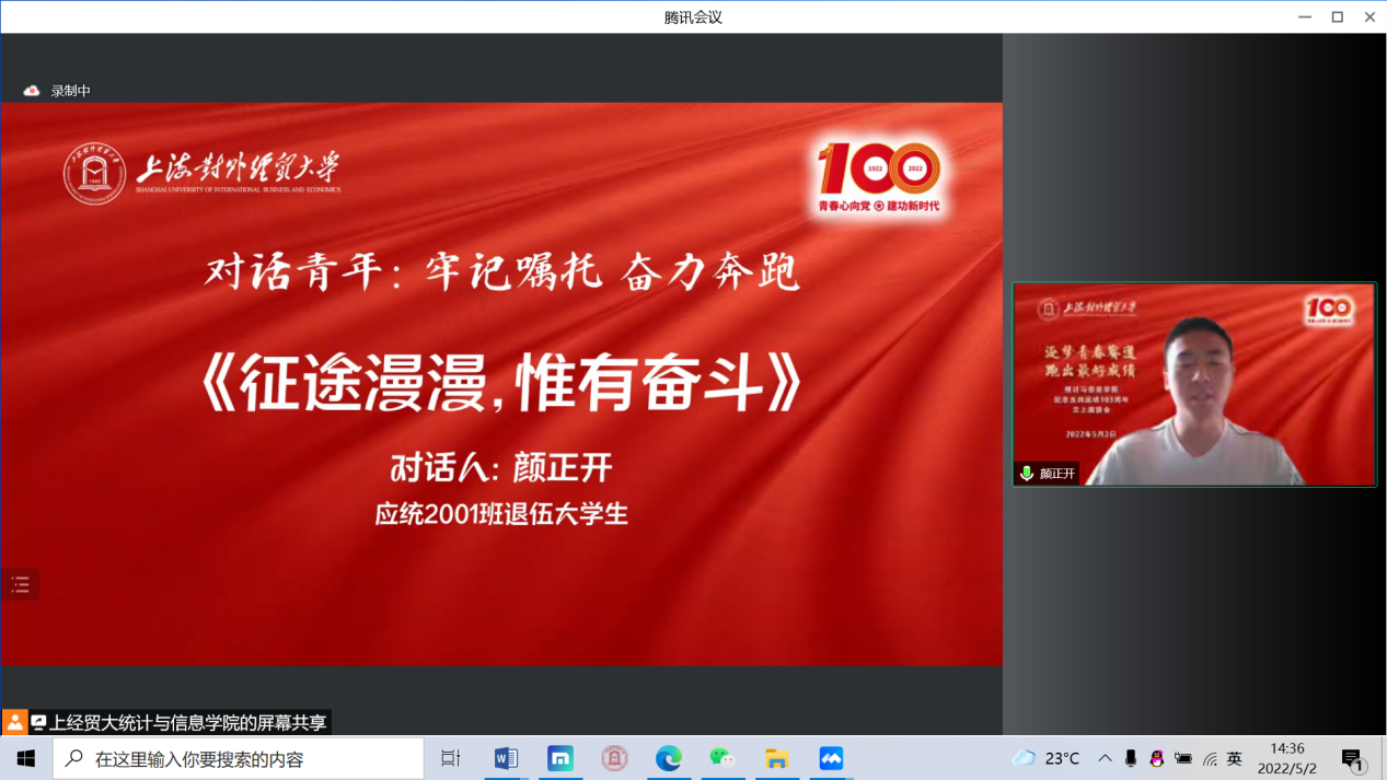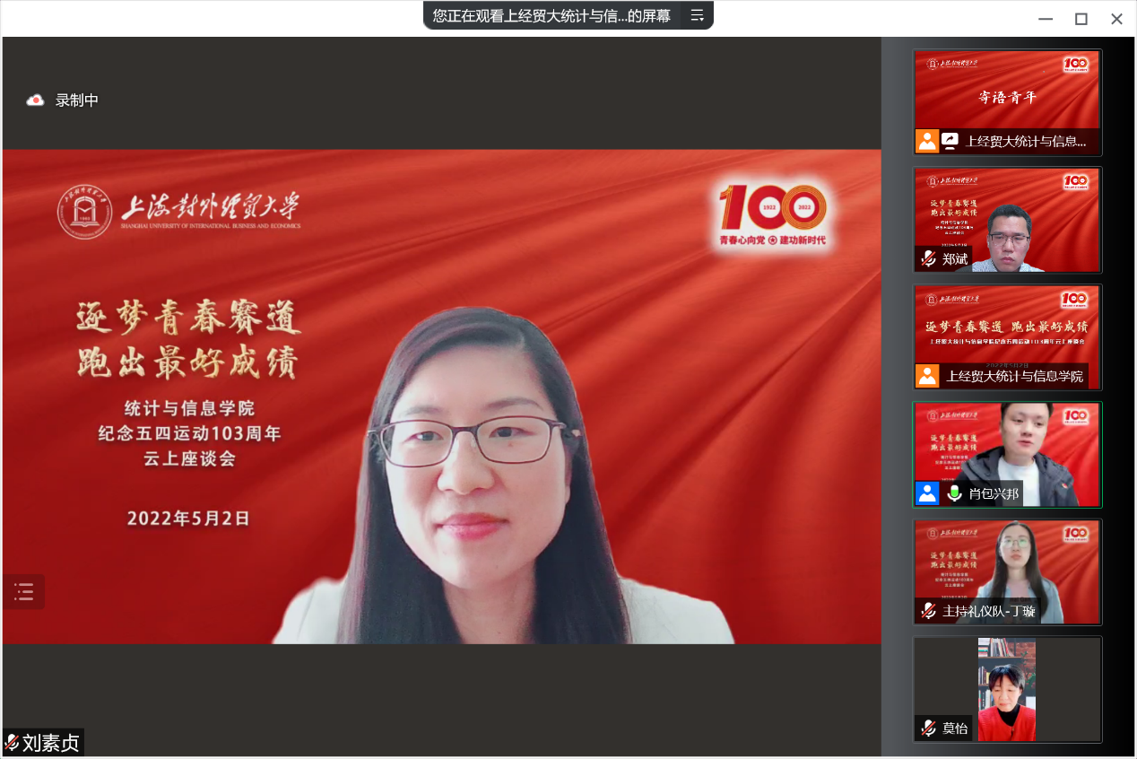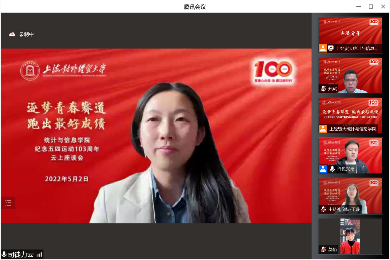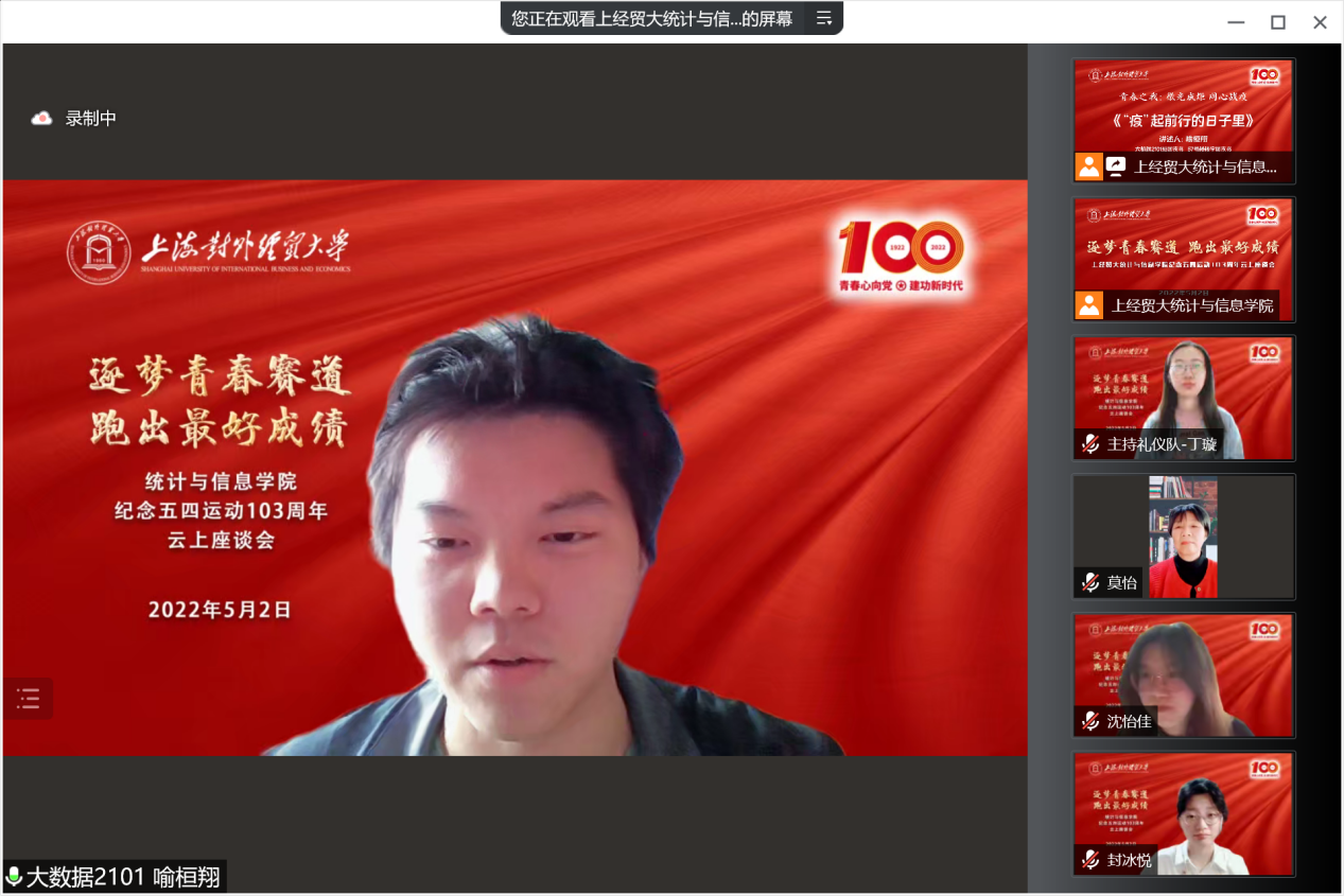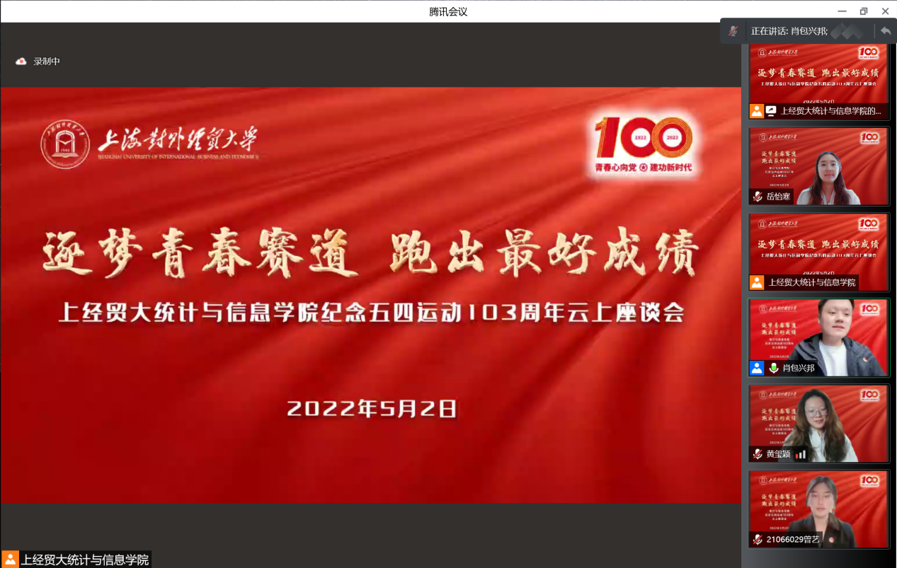 为深入学习习近平总书记在中国人民大学考察时的重要讲话精神,纪念五四运动103周年,庆祝中国共青团成立100周年,5月2日下午,统计与信息学院以“逐梦青春赛道 跑出最好成绩”为主题召开云上座谈会。活动分为青春之歌、青春之我、对话青年、寄语青年四个篇章,通过微团课、交流分享和座谈的形式,引导青年学生牢记嘱托,在青春赛道上跑出最好成绩,争做堪当民族复兴重任的时代新人。校关工委副秘书长、学院关工委分会副会长莫怡,校团委副书记司徒力云,学院院长刘永辉,院党委副书记(主持工作)刘素贞、党委副书记李睿,副院长刘慧、王利娟、赵倩,学院教师、辅导员代表以及学院党团员学生代表出席。会议由学院团委书记肖包兴邦主持。