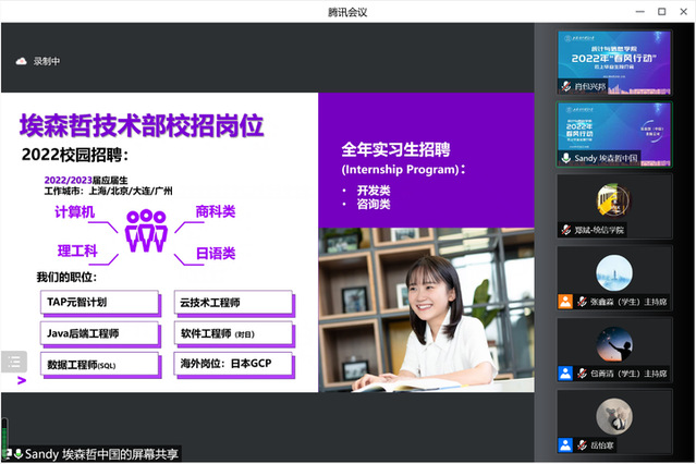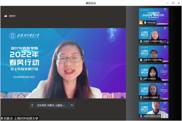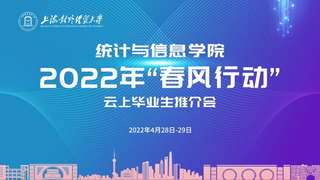 这是上海对外经贸大统计与信息学院推进实施的“春风行动”,为切实促进毕业生更充分、更高质量就业,积极搭建在校毕业生与用人单位精准供需对接的平台,于2022年4月起每周在线举办云上毕业生推介会。首场集中推介会于4月28日和29日两天滚动举行,吸引了埃森哲(中国)有限公司、上海投资咨询集团有限公司、上海泛微网络科技有限公司等15家用人单位,提供近60个就业岗位。25人初步达成了就业意向,约占招聘岗位的二分之一。