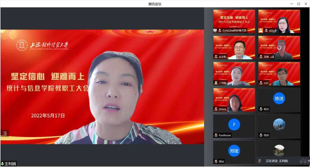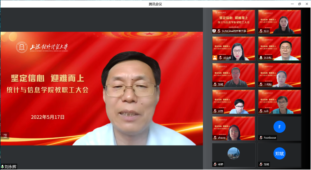 5月17日下午,统计与信息学院在线召开全体教职工大会,就近期疫情防控工作和学院教学、科研、毕业生就业及“访万企,读中国”社会调查项目等重点工作进行了部署,学院领导班子、全体教职工参加了会议。会议由院长刘永辉主持。