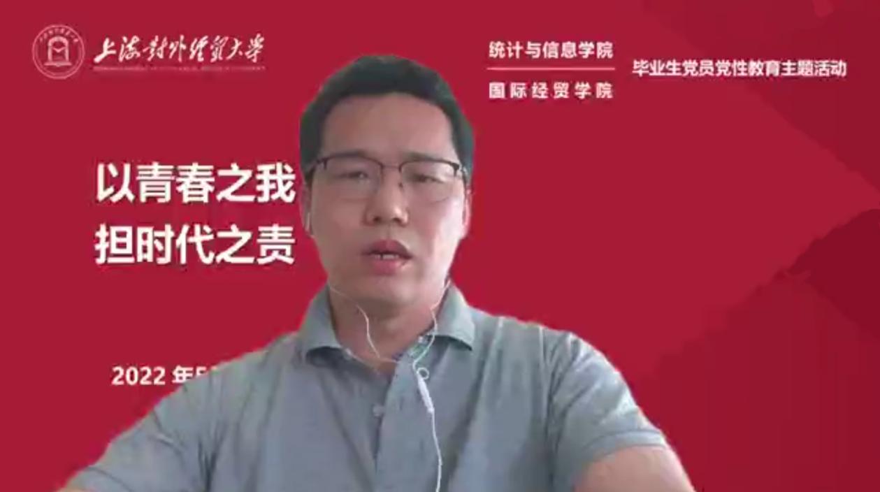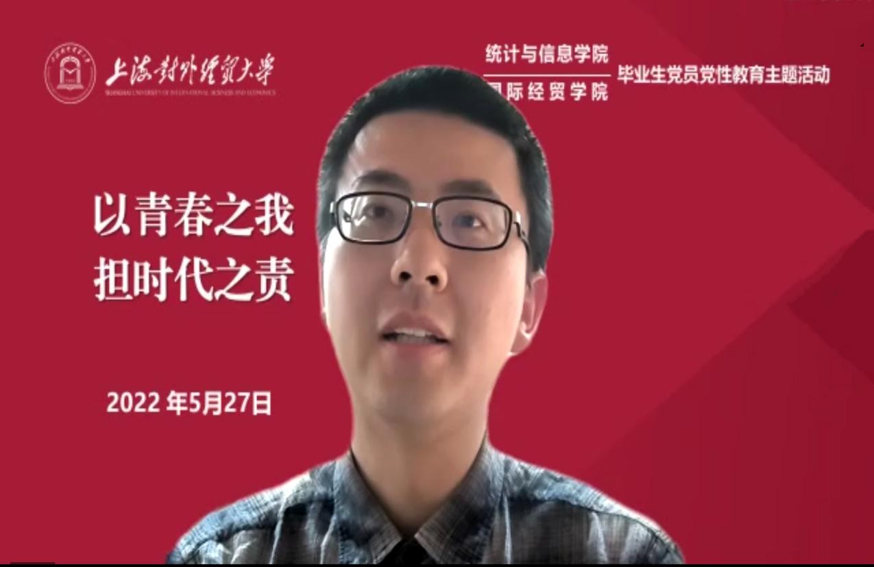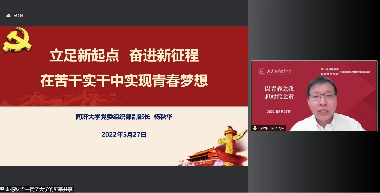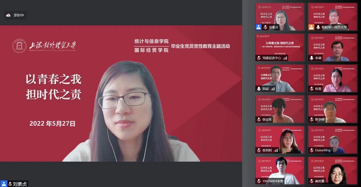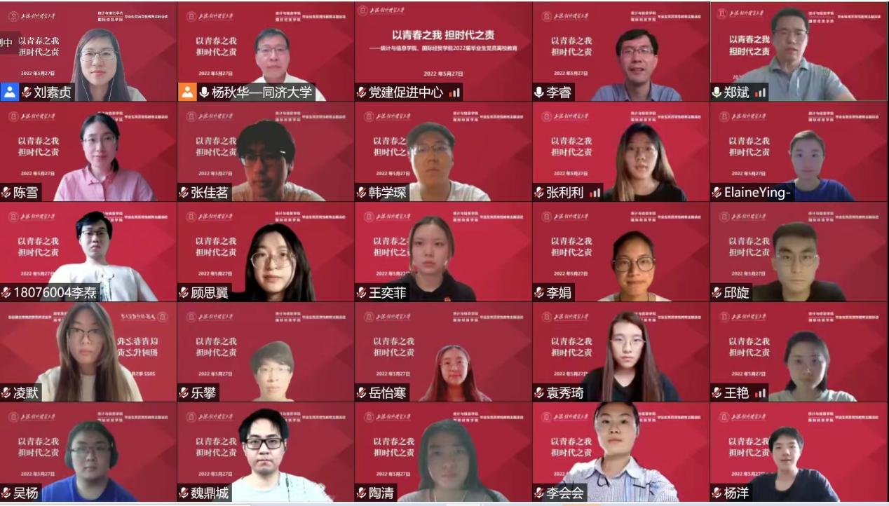 在2022届毕业生党员即将离开校园、步入社会之际,5月27日下午,统计与信息学院和国际经贸学院联合开展“以青春之我,担时代之责”2022届毕业生党员离校教育活动,通过专题党课、视频学习、入党宣誓、主题分享等形式,引导毕业生党员深入学习贯彻习近平总书记在中国人民大学考察时的重要讲话精神和在庆祝中国共产主义青年团成立100周年大会上的重要讲话精神,充分发挥党员先锋模范作用,不忘初心,砥砺前行。同济大学党委组织部副部长杨秋华,统计与信息学院党委副书记(主持工作)刘素贞,国际经贸学院党委副书记陈雪,统计与信息学院党委副书记李睿、党委组织员郑斌,统计与信息学院和国际经贸学院2022届毕业班辅导员、全体毕业生党员在线出席活动。活动由李睿主持。