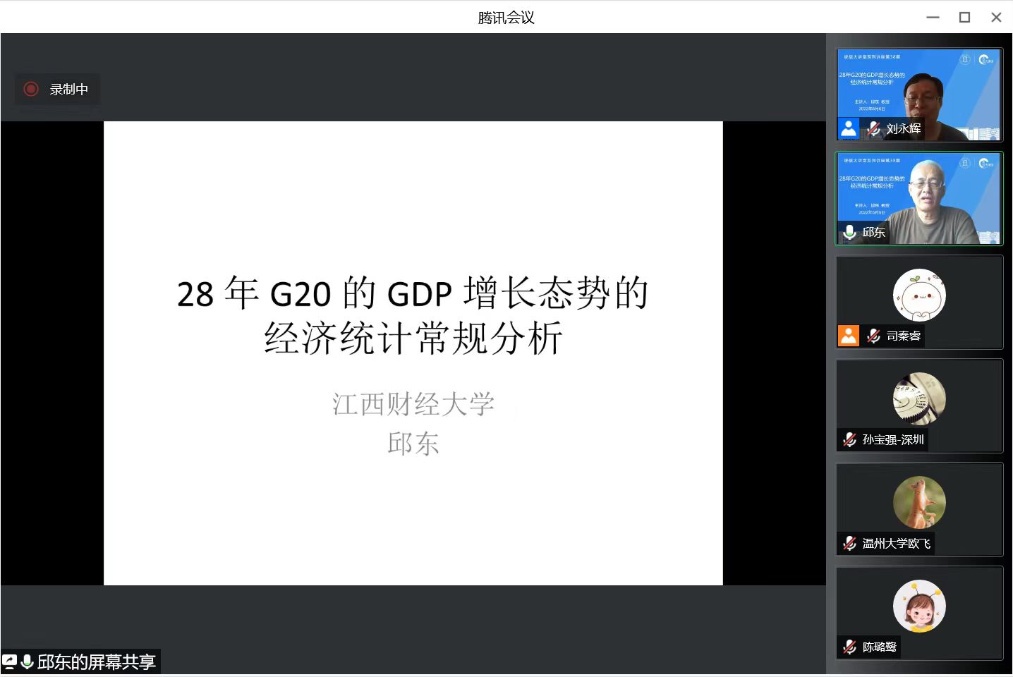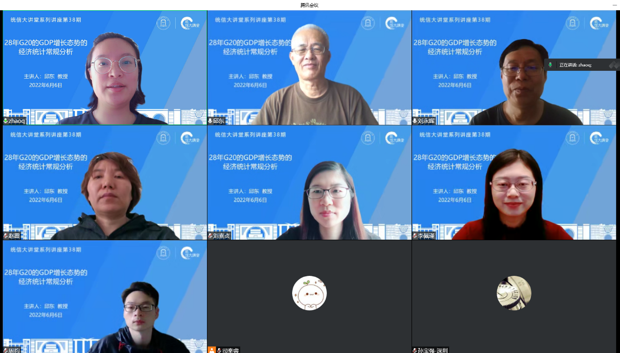 6月6日下午,“统信大讲堂”系列讲座第38期在线举行,江西财经大学讲席教授邱东应邀作题为“28年G20的GDP增长态势的经济统计常规分析”学术报告。讲座由统计与信息学院院长刘永辉教授主持,百余名校内外师生在线聆听。