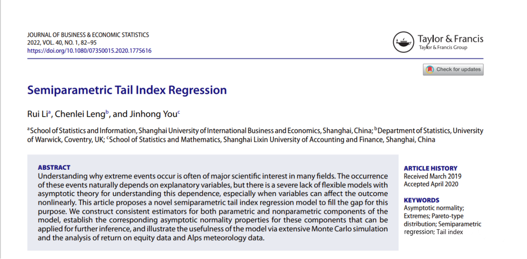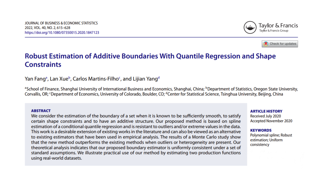 近期,李睿副教授与合作者撰写的论文《Semiparametric Tail Index Regression》、方艳副教授与合作者撰写的论文《Robust Estimation of Additive Boundaries With Quantile Regression and Shape Constraints》被统计学与计量经济学国际权威期刊《Journal of Business and Economics Statistics》发表,柳树副教授与合作者撰写的论文《Unifiedstatistical inference for a nonlinear dynamic functional/longitudinal datamodel》被统计学领域的权威期刊《Journal of Statistical Planning andInference》发表。《Journal of Statistical Planning andInference》、《Journal of Business and Economics Statistics》期刊被我校列为国际二类(I)期刊。