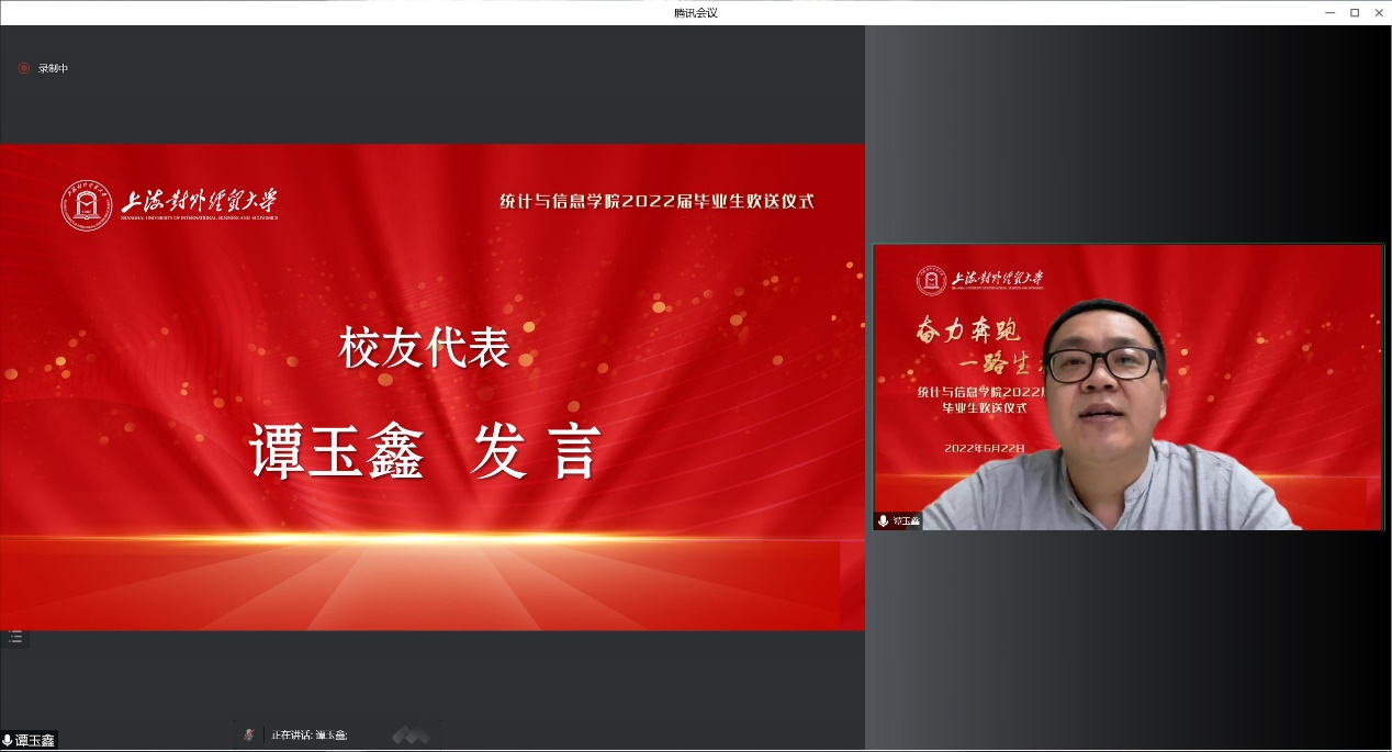 2017届数量经济学专业校友谭玉鑫作为校友代表发言。他回顾了自己在上海对外经贸大学统计与信息学院求学的生涯,感谢母校和学院的培养,他对即将毕业的学弟学妹们说,毕业意味着沉浸式学习的结束,也意味着游击式求学的开始,要做好终身学习的准备,努力成为堪当民族复兴重大任的时代新人,争取早日回馈社会。