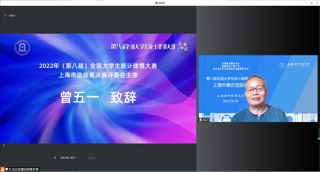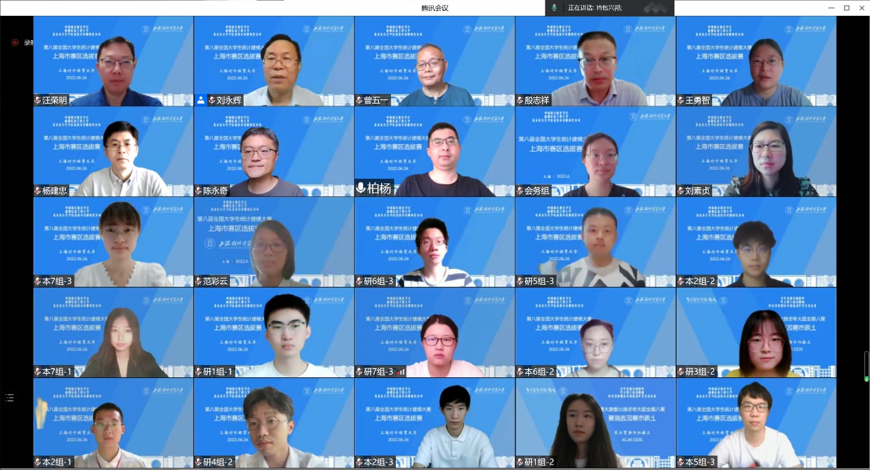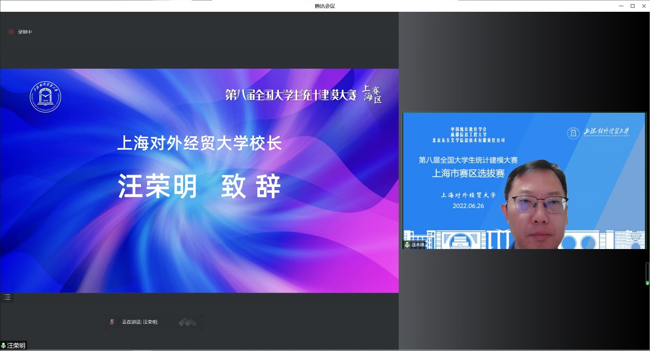 6月26日,由中国统计教育学会、教育部高等学校统计学类专业教学指导委员会和全国应用统计专业学位研究生教育指导委员会共同主办,我校统计与信息学院承办的第八届全国大学生统计建模大赛上海市赛区选拔赛在线成功举行。校长汪荣明出席大赛开幕式并致辞,来自上海市统计局、厦门大学等单位的专家、教授和大赛评委会委员,以及进入答辩赛的上海市高校参赛队伍代表参加开幕式。开幕式由校统计与信息学院院长刘永辉主持。