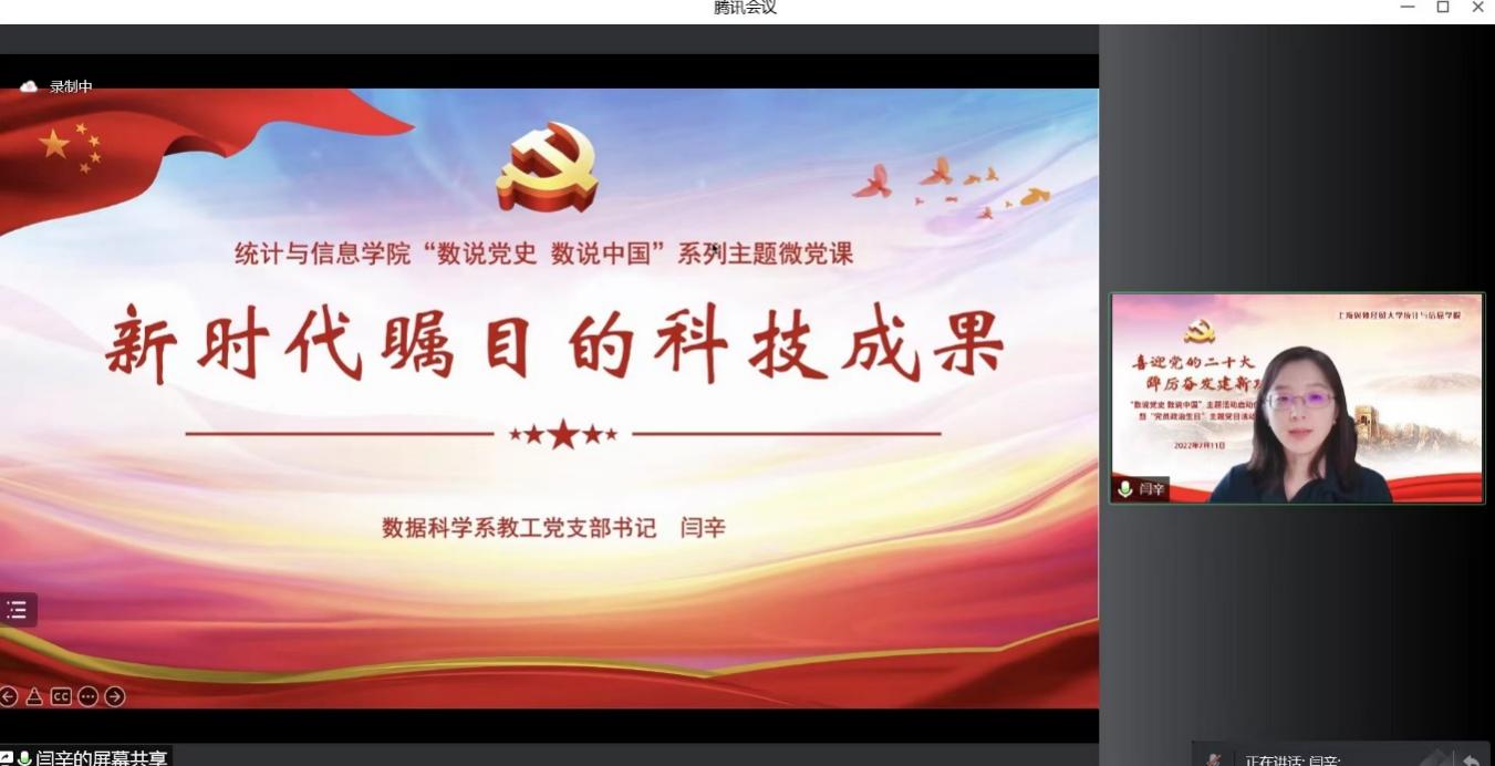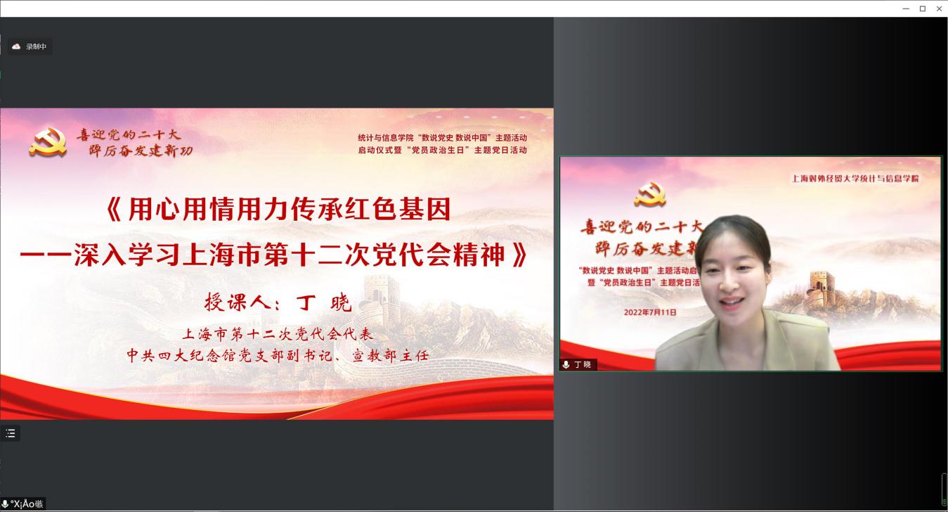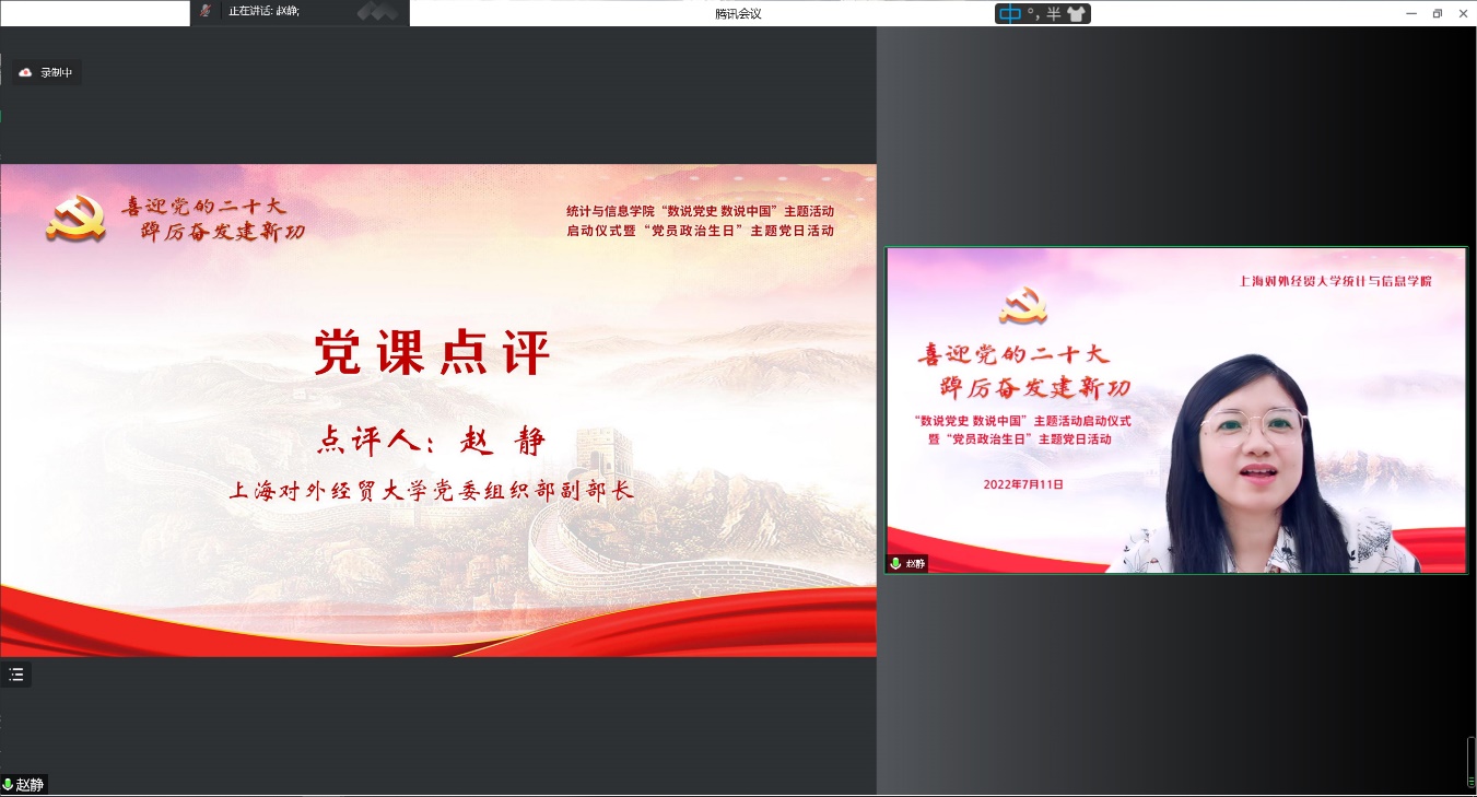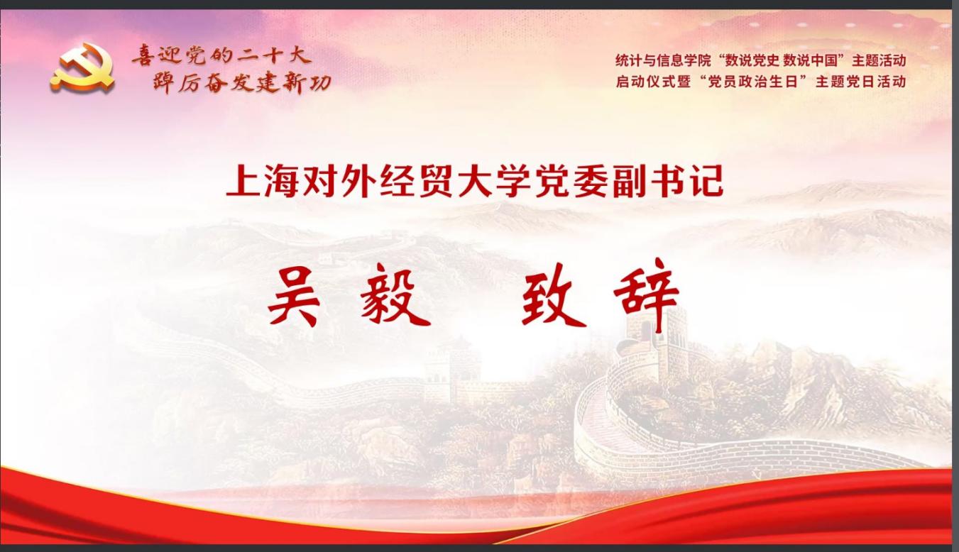 为迎接党的二十大胜利召开,深入学习贯彻落实上海市第十二次党代会精神,推动党史学习教育常态化长效化,统计与信息学院以“喜迎党的二十大 踔厉奋发建新功”为主题,于7月11日下午,在线举办“数说党史 数说中国”主题活动启动仪式暨“党员政治生日”主题党日活动。校党委副书记吴毅出席活动并致辞,上海市第十二次党代会代表、中共四大纪念馆党支部副书记、宣教部主任丁晓,校党委组织部副部长赵静,校关工委副秘书长莫怡,统计与信息学院党委领导班子、全体党员师生和入党积极分子近300人共同参加。活动由统计与信息学院党委副书记李睿主持。