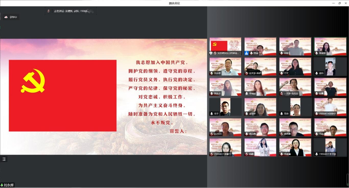 活动最后,统计与信息学院党委副书记、院长刘永辉领誓,全体与会党员在云端重温入党誓词。师生们纷纷表示,本次主题活动形式鲜活、内容深刻、收获满满,将进一步深入学习贯彻上海市第十二次党代会精神,认真学党史、知党史、用党史,弘扬伟大建党精神,牢记嘱托、砥砺奋进,在学习工作生活中争当排头兵和先行者,为学院和学校事业发展贡献智慧和力量,以优异的成绩迎接党的二十大胜利召开。