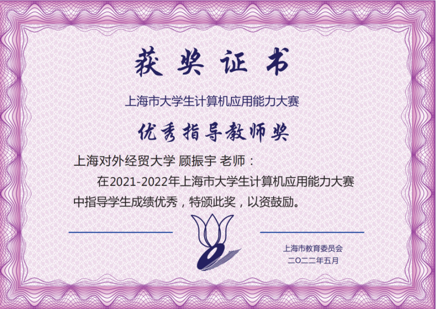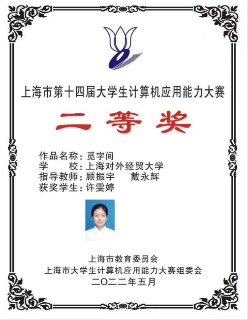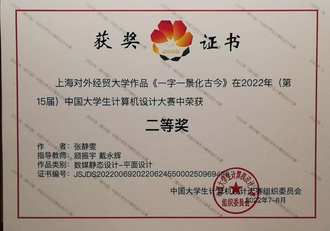 近日,2022年第十五届中国大学生计算机设计大赛顺利落下帷幕,我校学生队伍再创佳绩,斩获5项全国奖项,1支队伍荣获全国二等奖,4支队伍荣获全国三等奖。其中获全国二等奖的是由统计与信息学院顾振宇老师和工商管理学院戴永辉老师共同指导、张静雯同学设计的作品《一字一景化古今》。此前,在6月份结束的2022年上海市第十四届大学生计算机应用能力大赛(第十五届中国大学生计算机设计大赛省赛)中,我校学生共有8支队伍获奖,1项二等奖、6项三等奖、1项优胜奖,其中7支队伍参加国赛。由顾振宇和戴永辉老师指导、统计与信息学院许雯婷同学设计的作品《觅字间》荣获省赛二等奖、全国三等奖。顾振宇老师荣获2021-2022年度计算机市赛优秀指导教师奖。