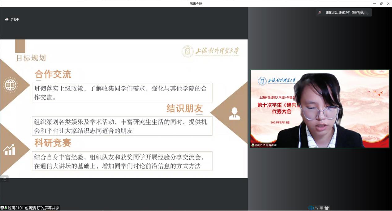 第四届研究生会主席团成员何磊向大会作了题为《“统”心协力,开拓创新,贡献青春力量;“信”守不渝,赤诚向党,彰显青年担当》的工作报告,阐释了研究生会在学院“理工固本、经贸铸魂”办学理念指导下,全力支持“大数据、人工智能+经济管理”交叉复合型人才建设所做出的的积极努力。工作报告由大会审议并通过。