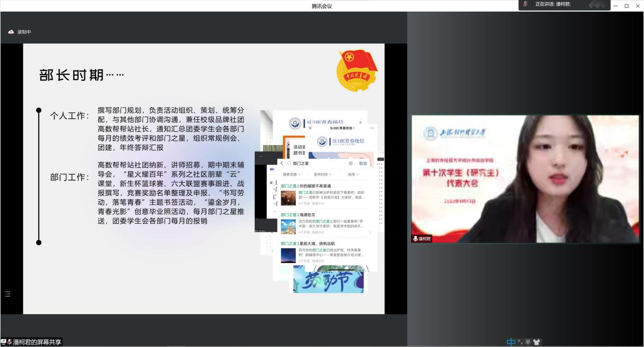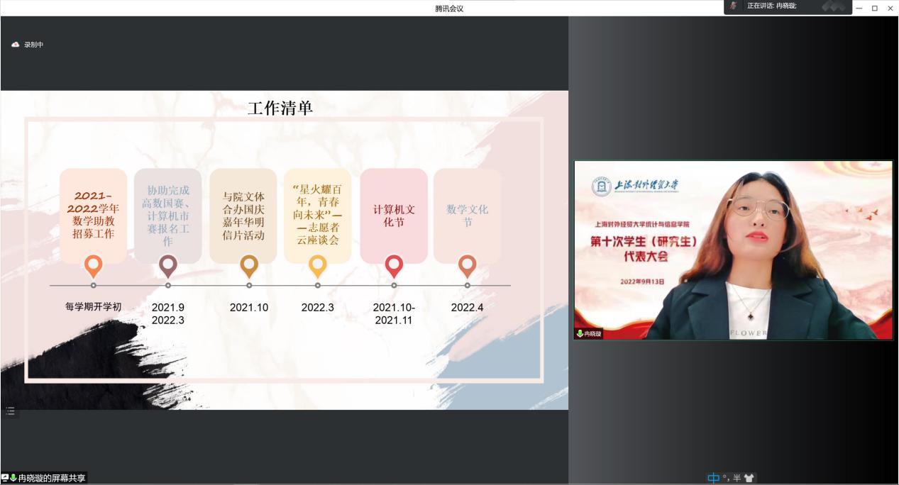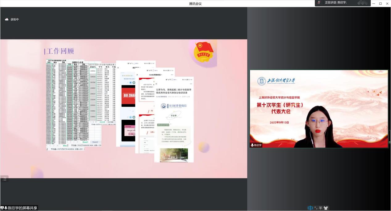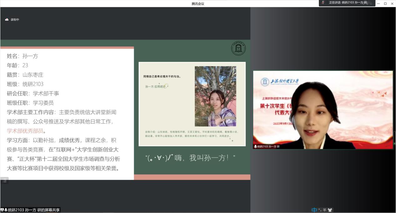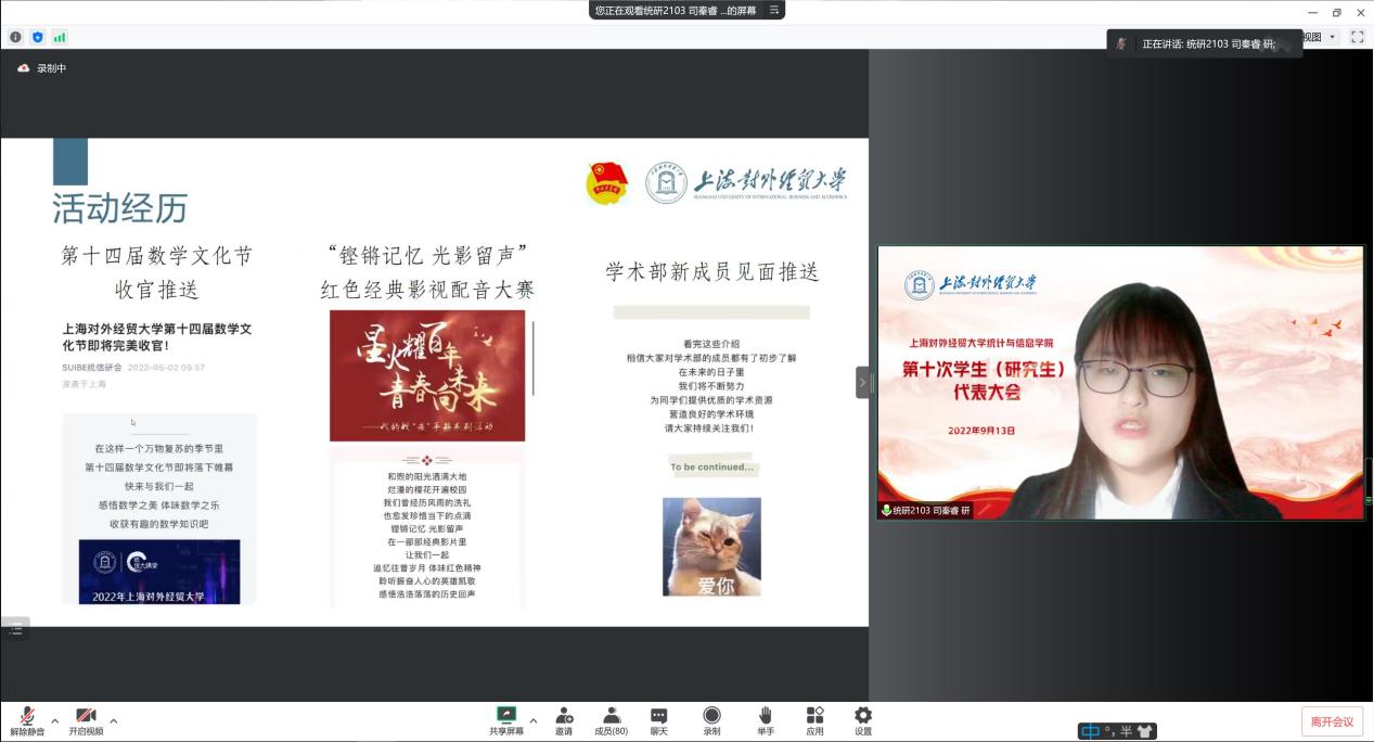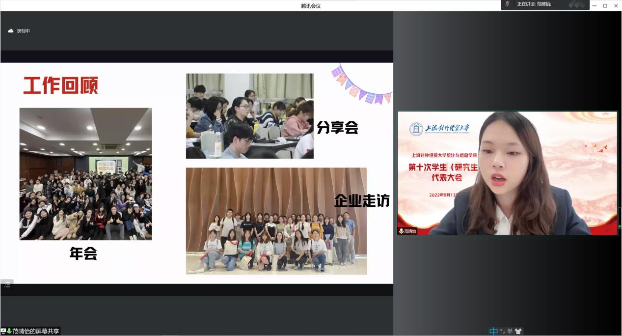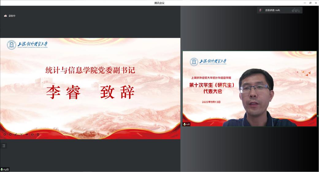 2022年9月13日,上海对外经贸大学统计与信息学院第十次学生(研究生)代表大会在线举行。上海对外经贸大学统计与信息学院党委副书记李睿,院团委书记肖包兴邦,学生党建主管冯越,团委副书记岳怡寒,上本科生党支部书记杨小帆,校学生会主席团成员丁隽仪同学,院学生会主席团成员沈怡佳同学、彭欣怡同学及65位学生、研究生代表出席了本次会议,会议由院团委副书记张君鸿同学主持。