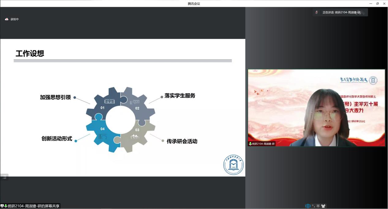 统计与信息学院第九届学生会主席团成员沈怡佳向大会作了题为《学生为本,服务为先,助力青年梦想;激扬青春,砥砺前行,筑梦统信华章》的工作报告,回顾了过去一年学生会在“引领青年思想、倾听青年需求、服务青年权益”的工作理念下所完成的各项工作。