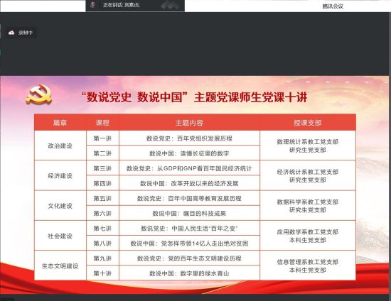 重点打造的主题党课由专家党课和师生党课两部分组成,分为“数说党史”和“数说中国”两大专题,围绕政治建设、经济建设、文化建设、社会建设、生态文明建设5个篇章开设10讲课程,包括《百年党组织发展历程》《读懂长征里的数字》《百年国民经济统计》《改革开放以来的经济发展》《百年中国高等教育发展历程》《瞩目的科技成果》《中国人民生活的“百年之变”》《党怎样带领14亿人走出绝对贫困》《党的百年生态文明建设历程》《数字里的绿水青山》等内容。主题党课由校外专家和学院师生党员共同讲授,引导师生学党史、展历程、读中国、看发展,打造为“党史+专业”育人新品牌。