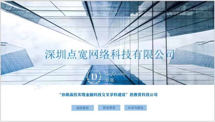 深圳点宽网络科技有限公司(以下简称“点宽”,又称Digquant),深耕金融科技教育领域,构建数字化实践教育服务平台,推动国内金融科技人才培养建设,培养“量化金融”、“金融+人工智能”、“金融+大数据”、“金融+区块链”的应用型人才。
