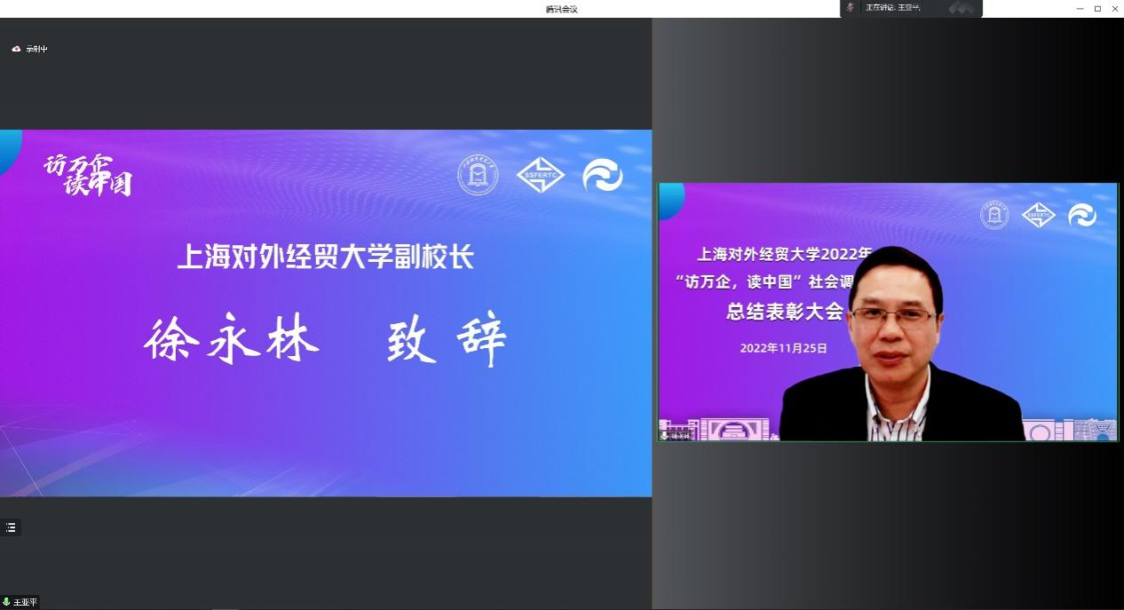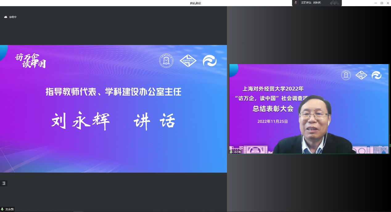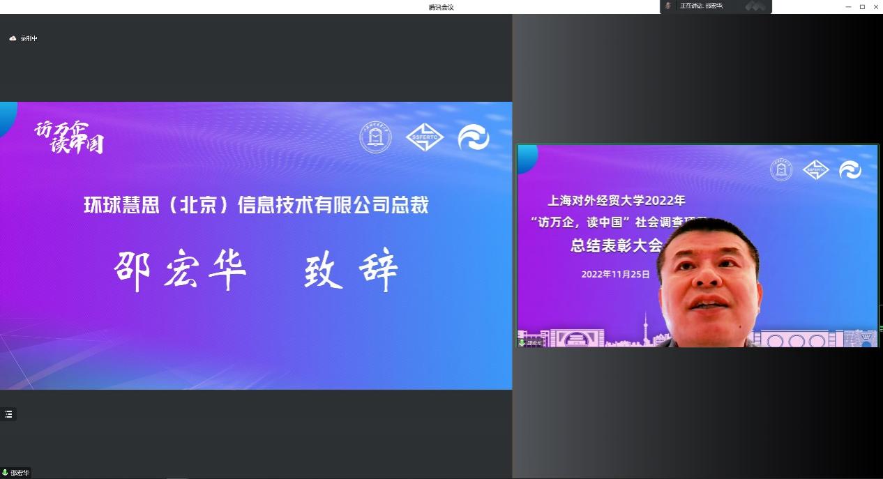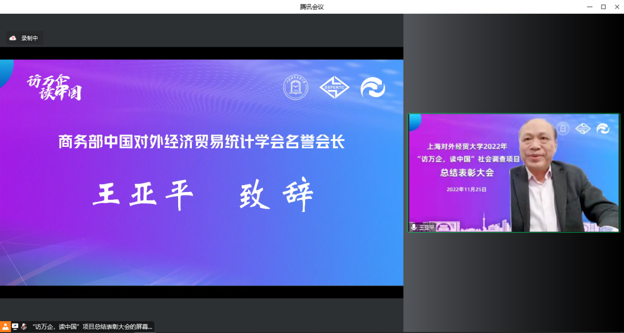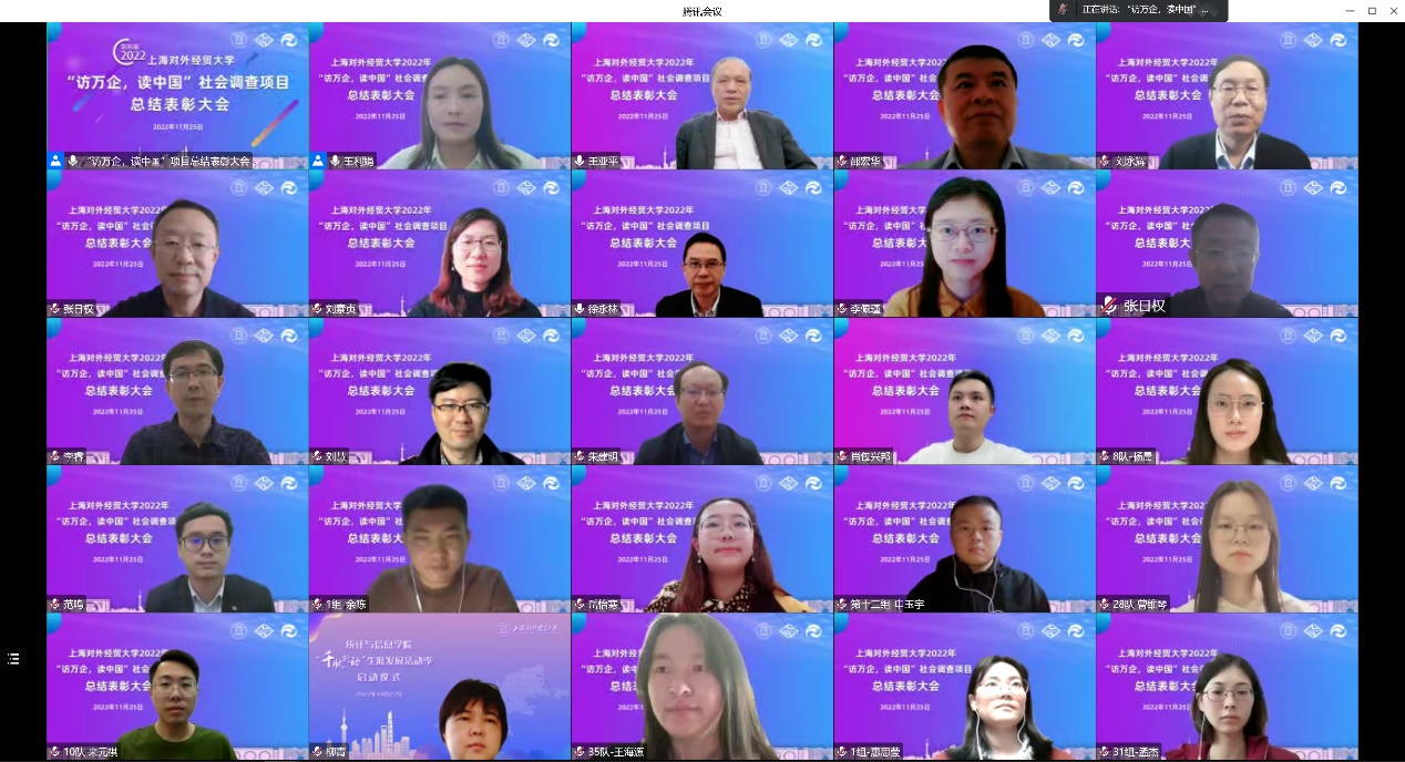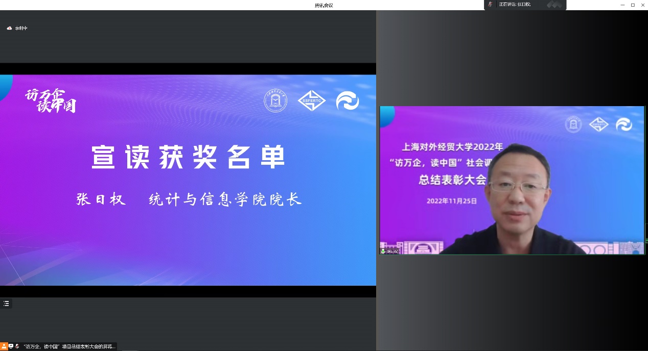 11 月 25 日下午,2022年“访万企,读中国”社会调查项目总结表彰大会在线上顺利举行。中国对外经济贸易统计学会名誉会长王亚平,上海对外经贸大学副校长徐永林,环球慧思(北京)信息技术有限公司总裁邵宏华,校学科建设办公室主任刘永辉,教务处处长朱建明,党委研工部副部长、研究生院副院长乔檀,统计与信息学院领导班子及项目师生代表共计100余人出席。会议由统计与信息学院副院长王利娟主持。