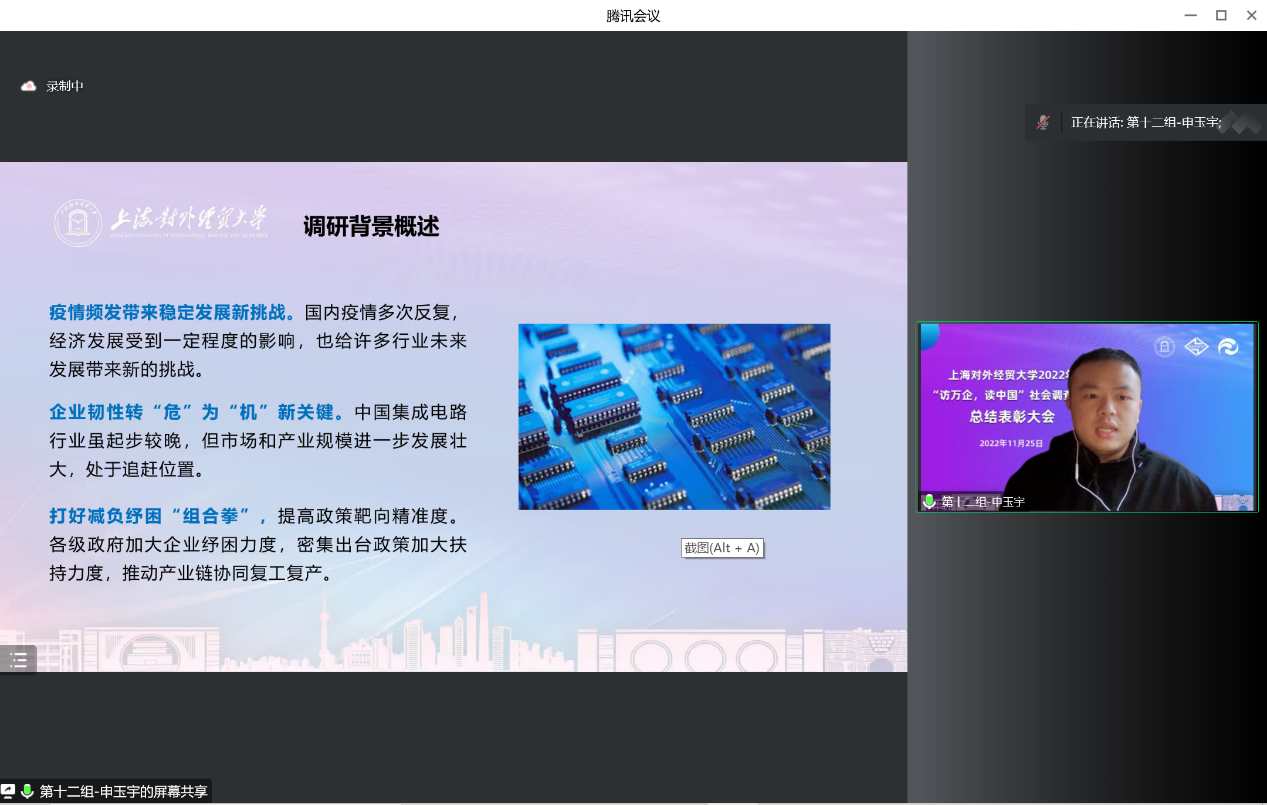 统计与信息学院硕士研究生申玉宇代表调研团队做了分享,团队聚焦芯片“卡脖子”问题,对长三角地区集成电路行业产业链上中下游企业进行调研,帮助企业应对疫情冲击与外部环境变化。调研成果获2022年“知行杯”上海市大学生社会实践大赛三等奖。