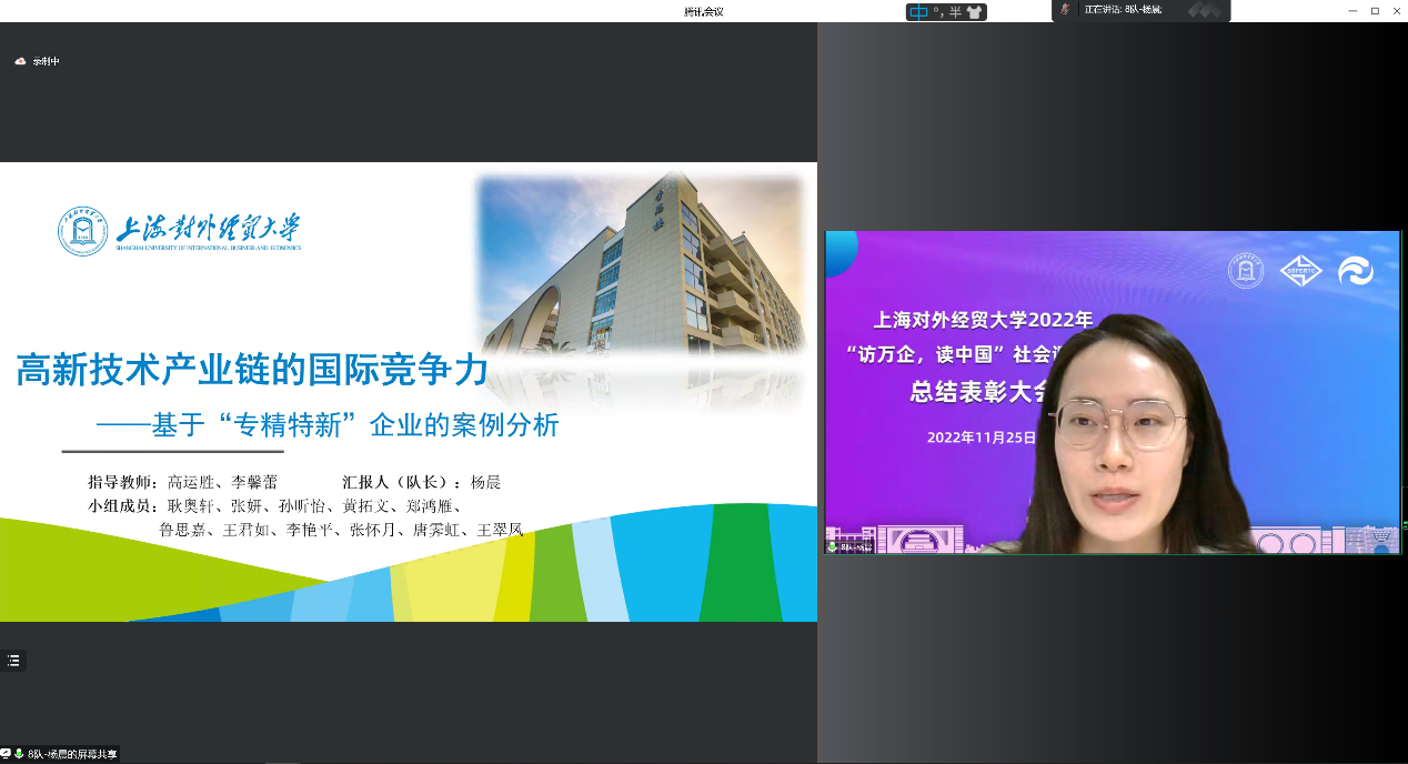 国际经贸学院博士研究生杨晨以《高新技术产业链的国际竞争力——基于“专精特新”企业的案例分析》为主题作项目成果展示。该团队由本硕博学生组成,以“专精特新”企业为重点调研对象,深入了解并评估企业韧性以及所在产业的产业链稳定性和国际竞争力。调研报告荣获团中央2022年“三下乡”、“返家乡”社会实践优秀调研报告。
