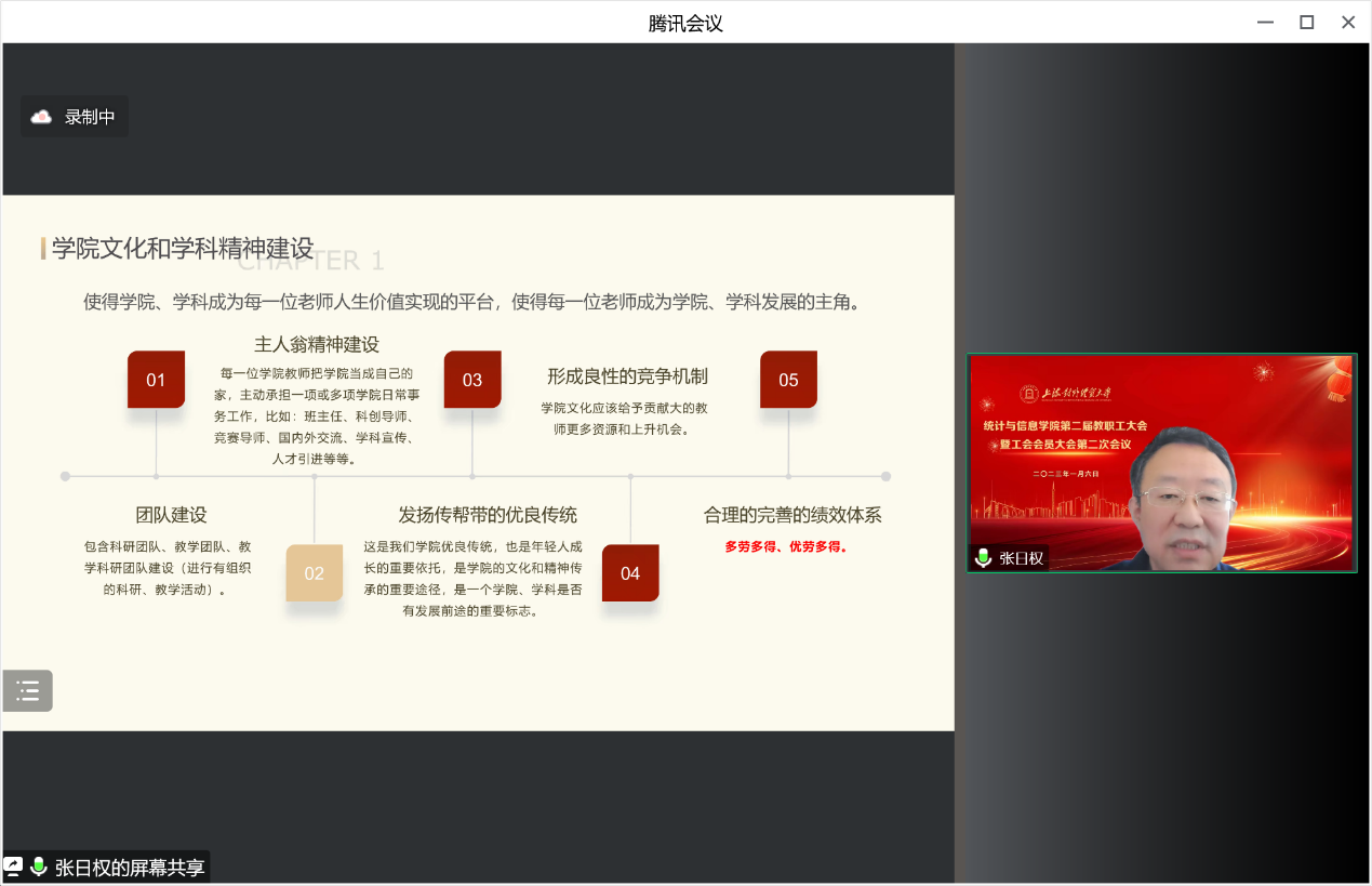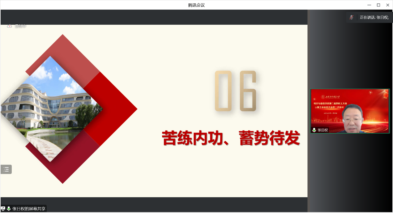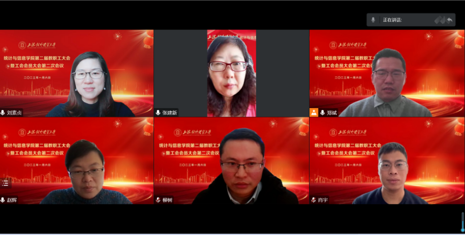 岁序更替,华章日新;云程发轫,万里可期。1月6日,上海对外经贸大学统计与信息学院第二届教职工大会暨工会会员大会第二次会议在线举行,学院领导班子、工会委员会委员以及全体教职工出席了会议。大会由学院党委书记刘素贞主持。