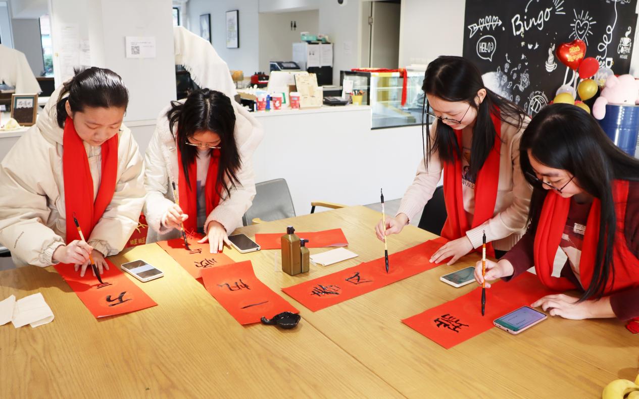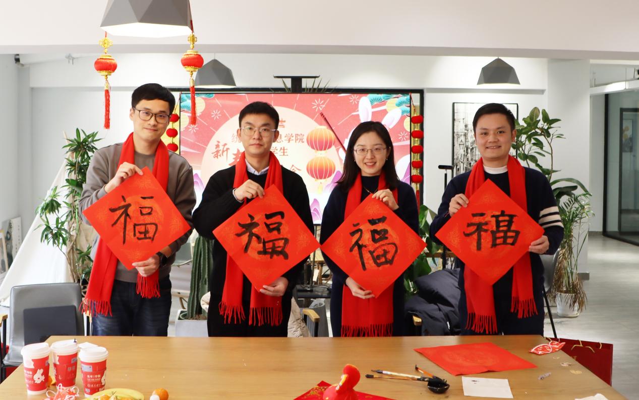 活动现场,学院师生们共同撰写喜庆的书法 “福”字和春联,红艳艳的春节书法作品表达了老师与同学们对新春佳节的美好祝福以及对未来美好生活的无限向往。此外,学院还为同学们送上了福气满满的新春大礼包以及新年口罩,师生们一起分享新年蛋糕,共迎美好新年!