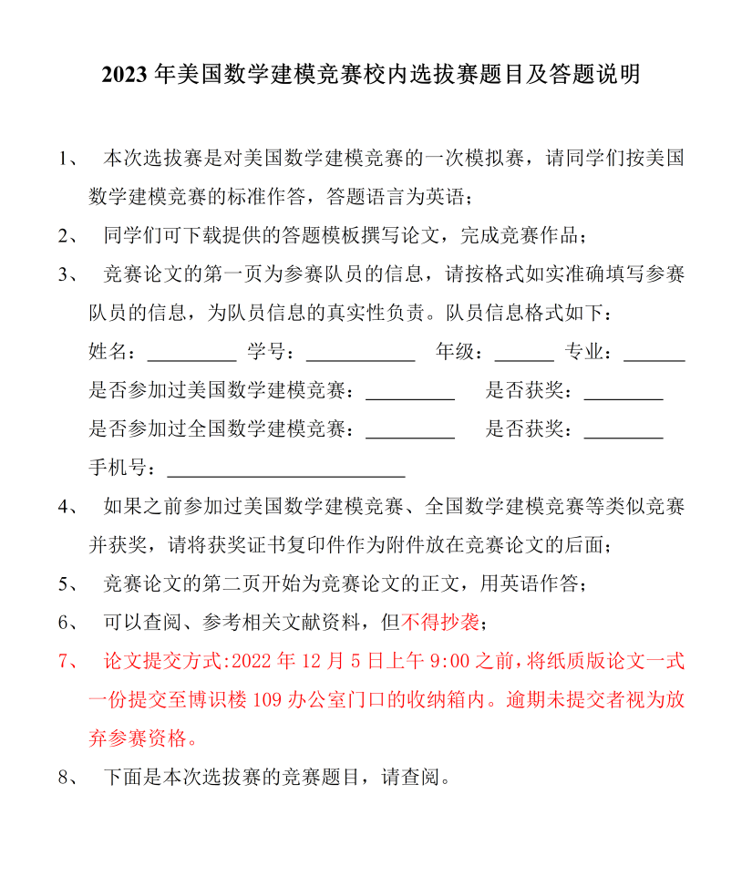 请各队队长将参赛论文命名为“美赛论文+队长姓名”以PDF格式于截止时间12月5日(周一)早上9:00前发送至【shumolian_2022@163.com】