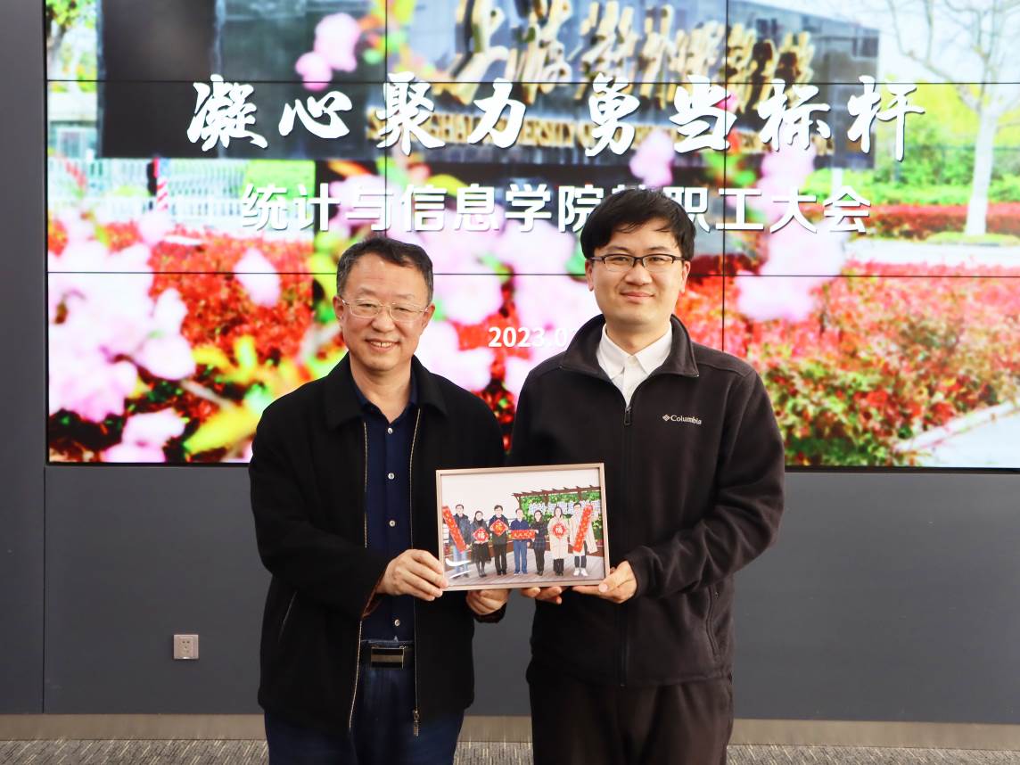 会议最后为刘慧老师举行了离任致谢仪式。刘素贞代表学院对刘慧老师担任学院副院长期间的卓越贡献和取得的突出成绩给予充分肯定,对他的勤勉工作和务实奉献表示衷心的感谢。学院领导为刘慧老师送上纪念品。刘慧向学院全体教职工表达了感谢,他表示将不忘初心,在教师岗位上用心用情教书育人、积极钻研,一如既往支持学院发展。