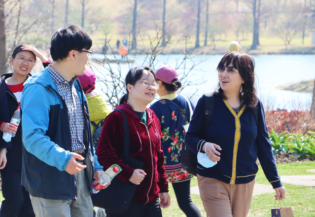 在前往矿坑花园的路上,步移景异,岸边柳条随风飘舞,几只天鹅徜徉水面,悠闲自在。梅花、玉兰、鸢尾、海棠等各种花卉,共同编织着五彩斑斓的美好春天,令人神清气爽,心情愉悦。大家边走边聊,一扫平时繁忙的工作带来的疲惫,欢声笑语此起彼伏,处处洋溢着教师们的活力与热情。图片