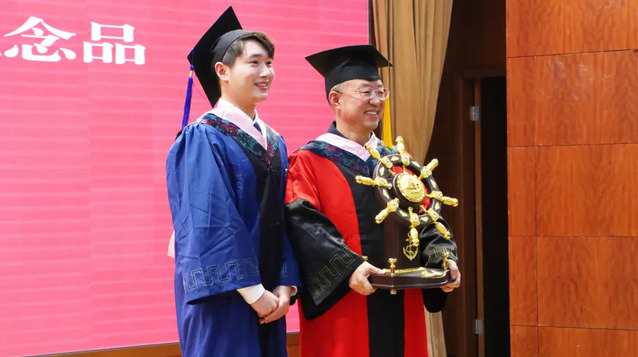 2023届研究生毕业生向学院赠送纪念品——领航舵,寓意开拓进取、一帆风顺,祝福学院在新征程上行稳致远、乘风破浪。张日权代表学院接受纪念品。