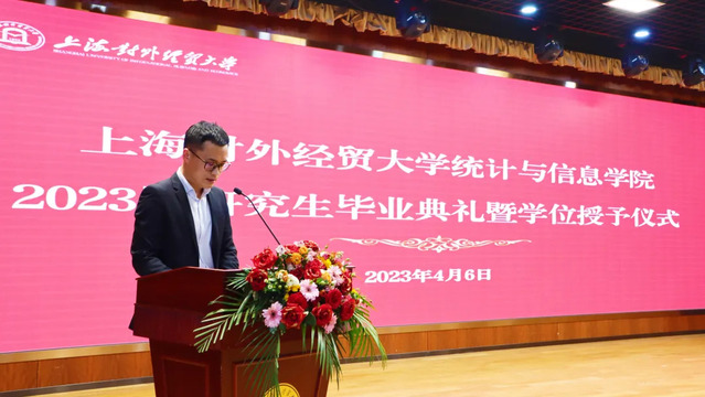 4月6日下午,上海对外经贸大学统计与信息学院2023届研究生毕业典礼暨学位授予仪式在松江校区图文信息大楼507报告厅举行。统计与信息学院党委书记刘素贞,院长张日权,院党委副书记范鸣,副院长王利娟、赵倩、李睿出席毕业典礼。学院各系主任、导师代表、辅导员,2023届全体研究生参加了毕业典礼。毕业典礼由范鸣主持。