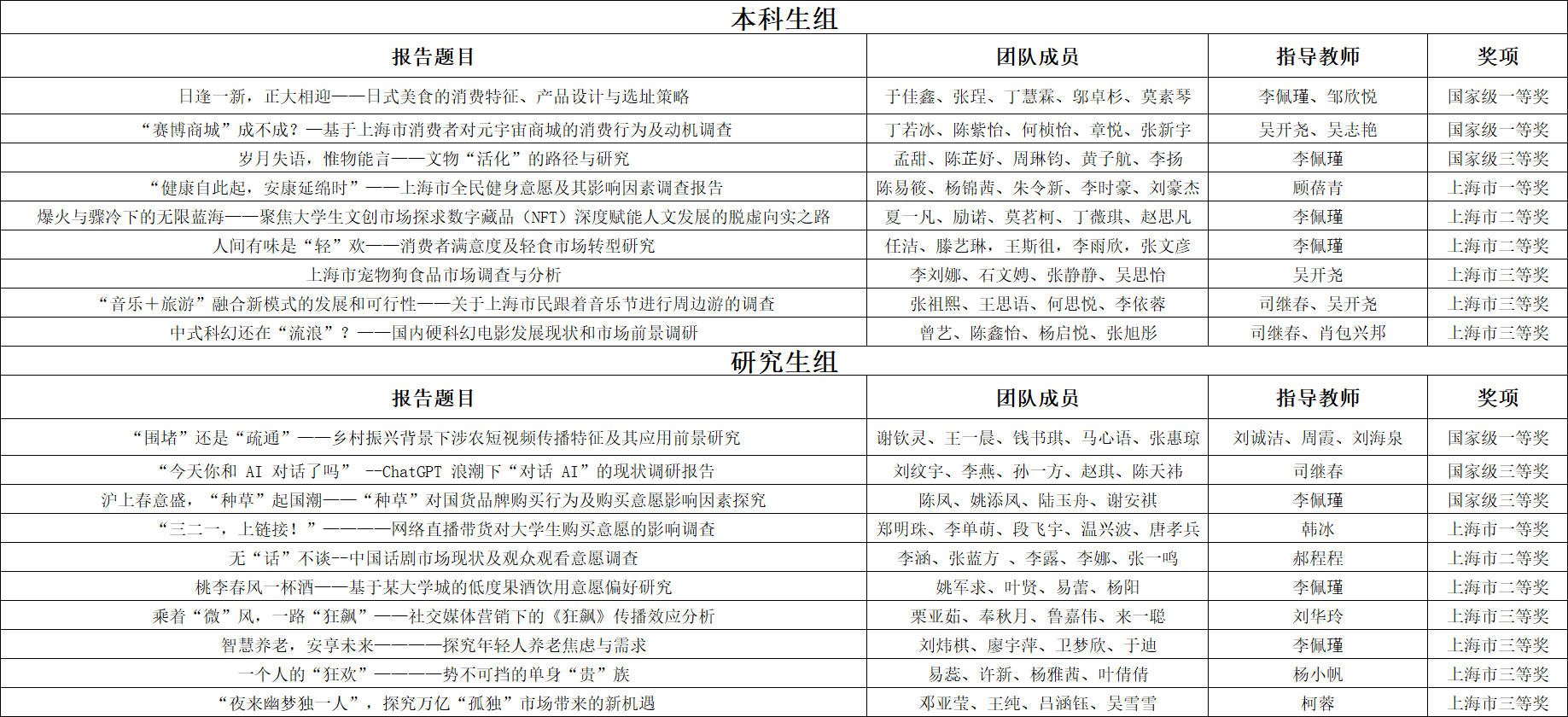 近日,历时9个月的第十三届全国大学生市场调查与分析大赛落下帷幕,我校本科生与研究生共获得国家一等奖3项、三等奖3项,上海市一等奖2项、二等奖4项、三等奖8项,其中国家一等奖项首次获重大突破,创参赛以来的最好佳绩。