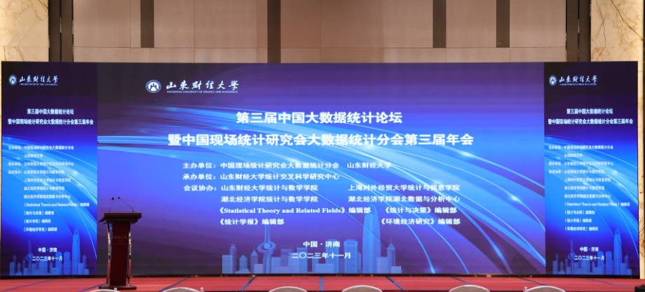 为进一步促进大数据统计学科发展,加强统计学、计算机、数学等数据科学相关领域的学术交流,2023年11月3日-5日,由中国现场统计研究会大数据统计分会和山东财经大学联合主办,上海对外经贸大学统计与信息学院等单位协办的第三届中国大数据统计论坛暨中国现场统计研究会大数据统计分会第三届年会在山东济南顺利召开。本次会议采用线上线下相结合的形式,现场吸引了来自北京大学、清华大学、山东大学、中国科学院、中国人民大学、厦门大学等百余家高校及研究机构的近400位专家和学者参加了现场会议,9万余人观看了线上直播。大会组织了9场大会报告,49场分组报告,并举办首届研究生论坛20余场学术报告。作为主要协办方之一,上海对外经贸大学统计与信息学院深度参与会议的筹划与组织工作,保障了会议的顺利举行。中国现场统计研究会大数据统计分会理事长、统计与信息学院院长张日权,副院长赵倩、王利娟、李睿,部分教师代表以及近30位硕士研究生参加了会议。开幕式由山东财经大学统计与数学学院院长安起光主持。