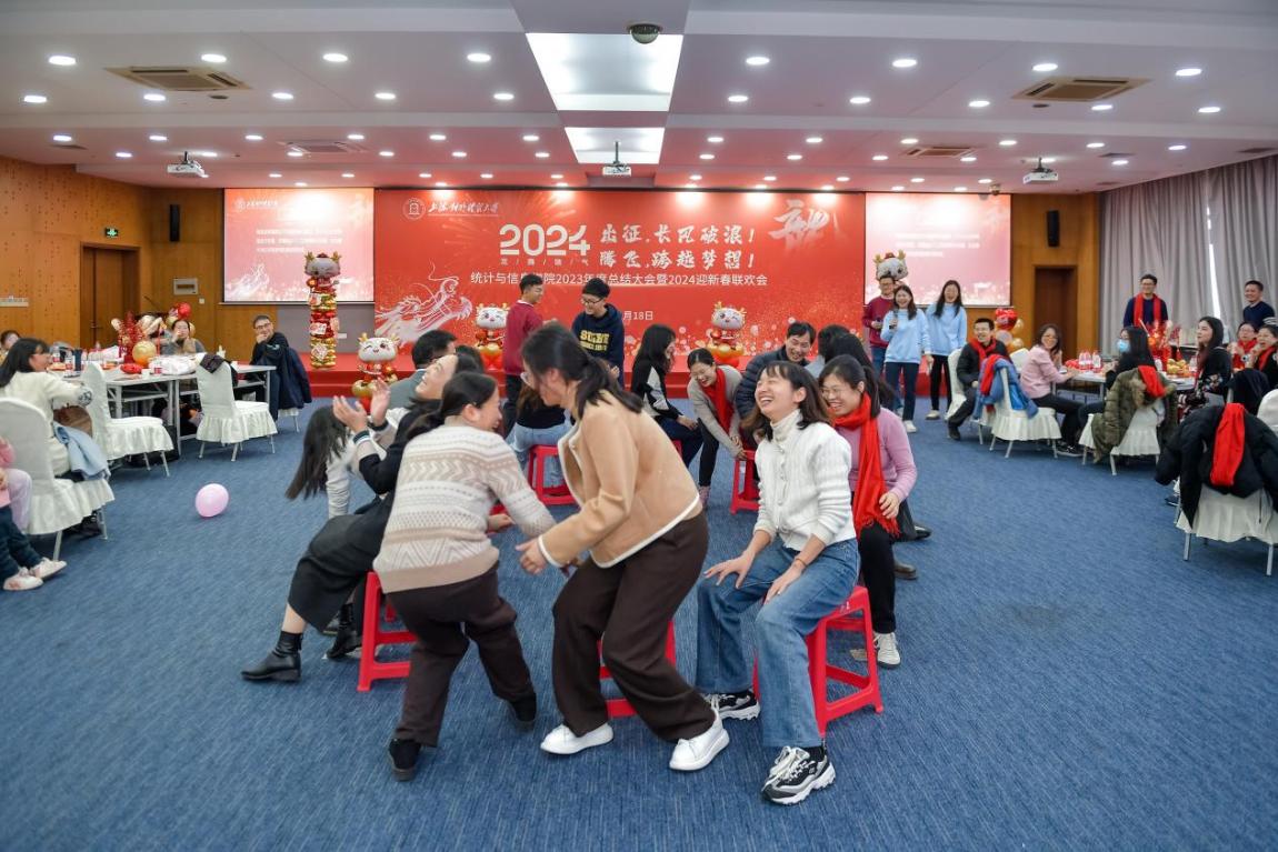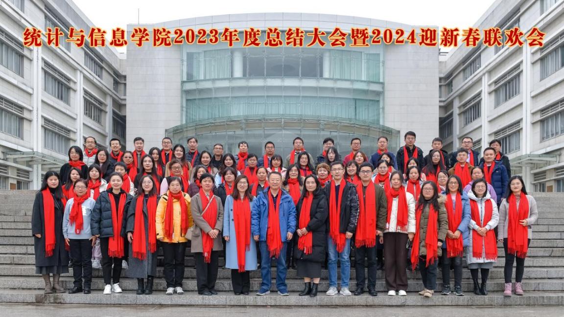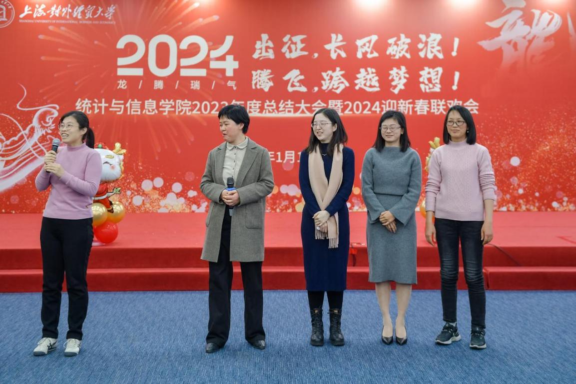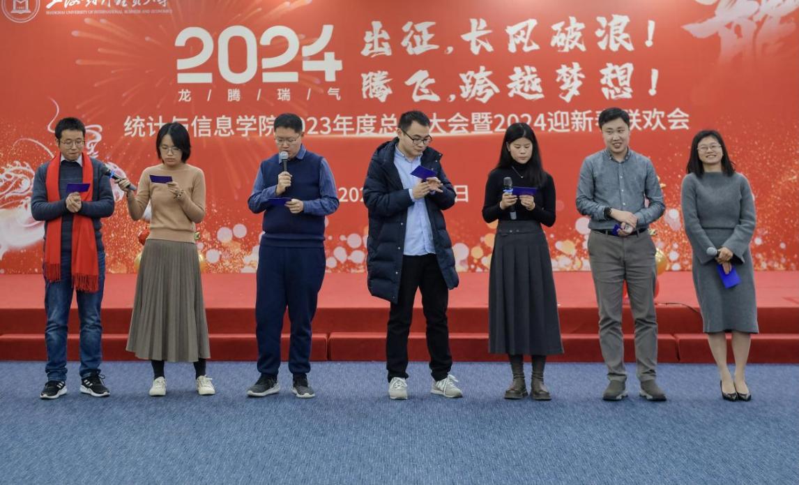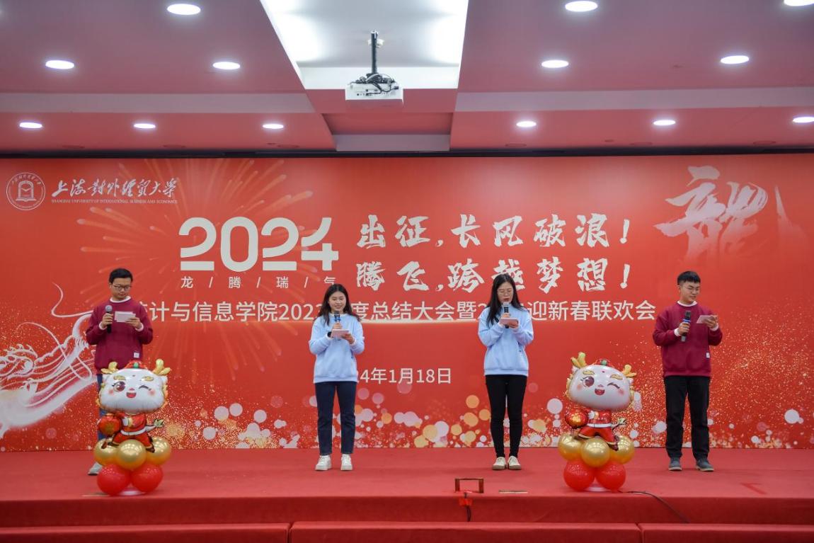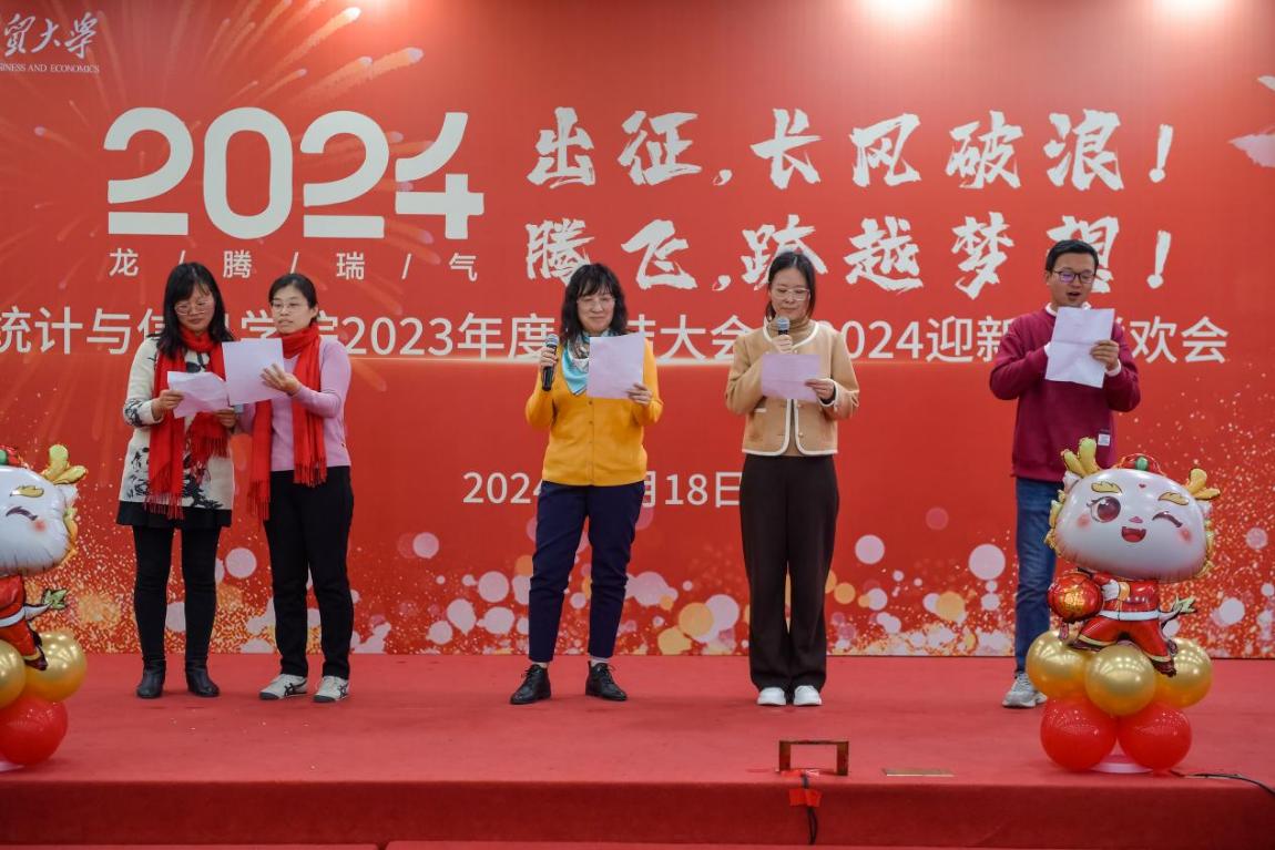 1月18日下午,统计与信息学院以“出征,长风破浪!腾飞,跨越梦想!”为主题,在信息楼526会议室举行2023年度总结大会暨2024迎新春联欢会,学院全体教职工欢聚一堂,回顾2023,展望2024,喜迎新春,共话发展。总结大会由学院党委书记刘素贞主持。