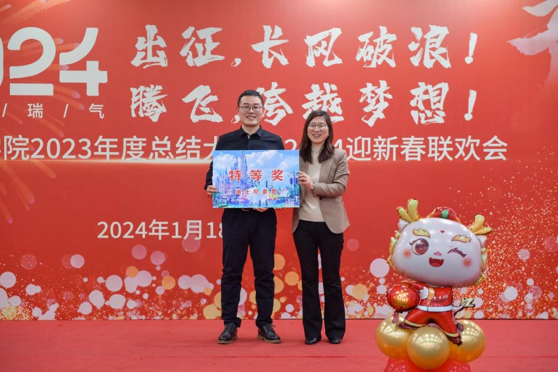 学院领导们纷纷为教职工送上新年祝福。张日权院长为龙年本命年的教职工赠送了纪念品,祝福他们在新的一年吉祥如意。各系主任纷纷表达了对老师们的感谢和祝福,对学院事业发展的美好祝愿。刘素贞书记引用诗人流沙河的《理想》一诗勉励大家:“请乘理想之马,挥鞭从此起程,路上春色正好,天上太阳正晴。”希望全体教职工高扬理想,以奋斗、以激情、以团结、以担当,在2024年浓墨重彩书写崭新篇章!