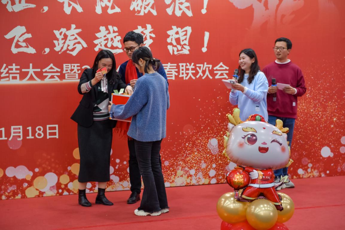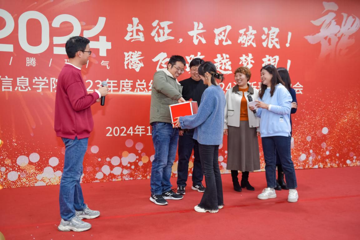 总结会后,学院举行迎新春联欢会。联欢会由2023年新进教师代表秦杏、孙强、刘轩旖和彭鹏主持。