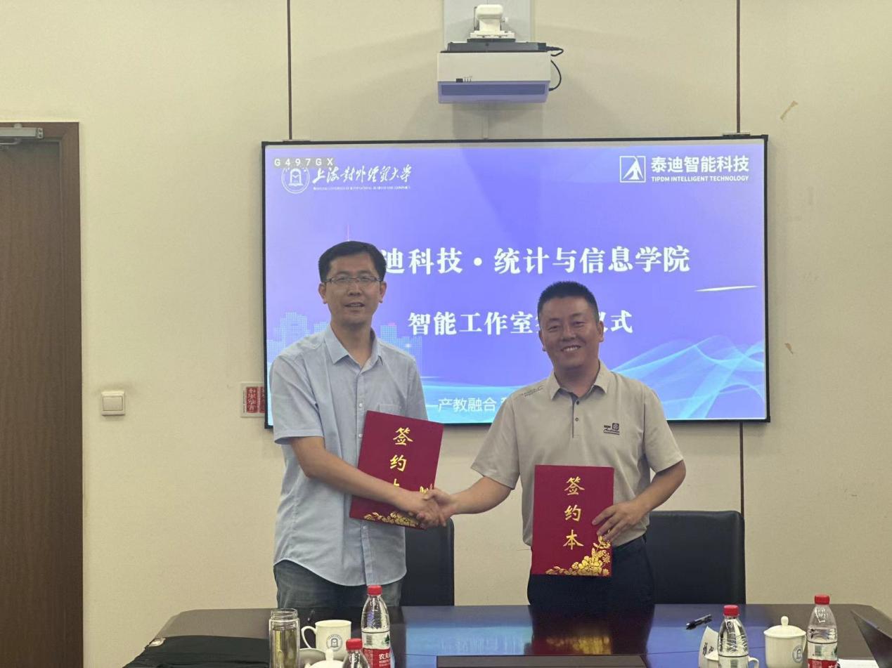 在签约仪式环节,彭艳昆总经理与李睿副院长分别代表双方签署了合作协议,标志着“泰迪·上经贸大统计与信息学院智能工作室”正式成立。
