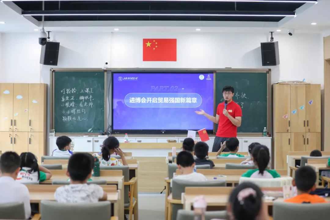 在石湖荡镇李塔汇学校和中山街道党群服务中心,宣讲团讲师舒不了担任了“数说贸易强国”微课的主讲人。他通过习近平总书记在中国共产党第二十次全国代表大会上的讲话,引导小朋友们理解中国成为贸易强国的重要意义。
