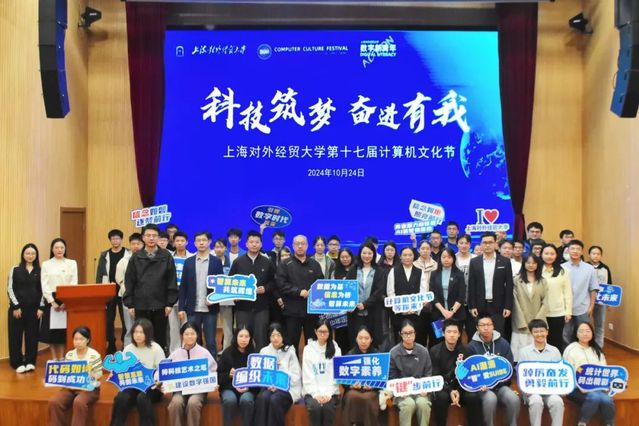 10月24日中午,“科技筑梦,奋进有我” 上海对外经贸大学第十七届计算机文化节开幕式在思源报告厅举行。统计与信息学院党委书记黄静、校教务处副处长王磊、校创业学院副院长高伟、校团委副书记卢毅聪、院党委副书记范鸣、副院长李睿、王利娟以及全校350名师生代表共同参加开幕式。