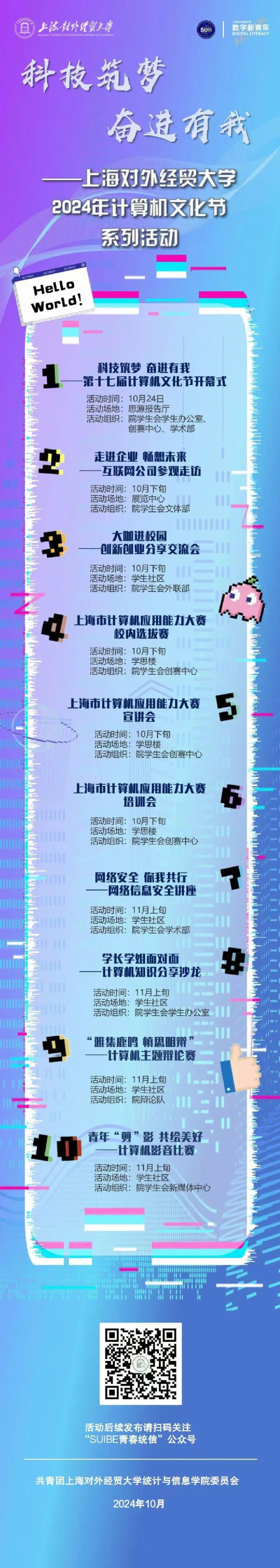 学校第十七届计算机文化节由统计与信息学院主办,为期一个月,活动包括专题辩论赛、计算机应用能力大赛、学长学姐面对面、大咖进校园等丰富活动,各项赛事将面向全校师生公开报名,希望同学们能将专业所学应用到计算机实践中,积极拥抱数字时代,为数字中国建设贡献青春力量。