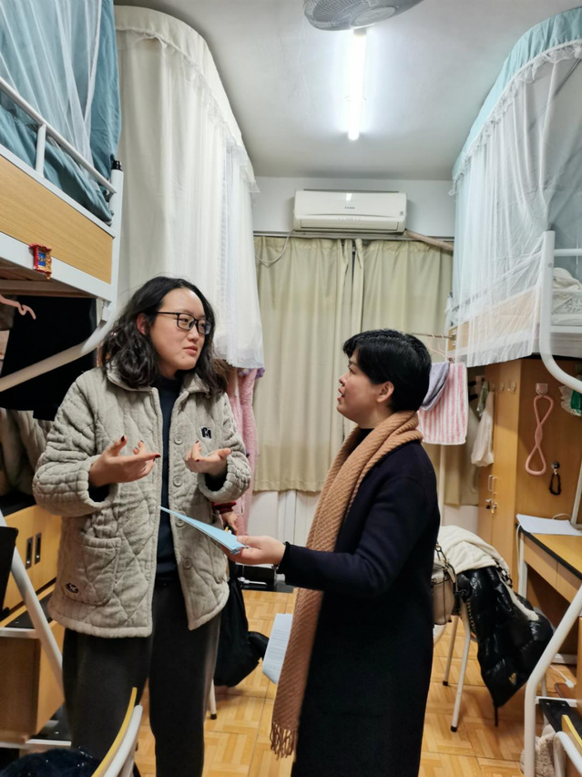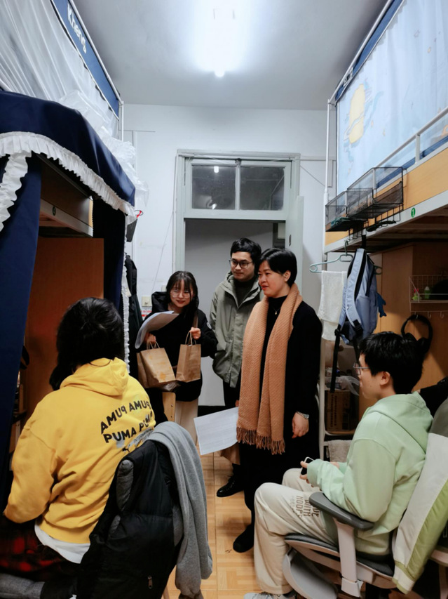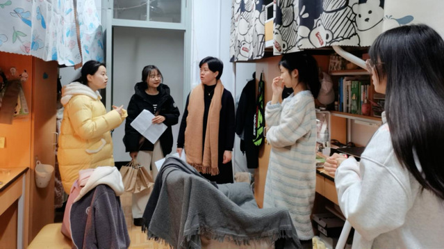 在走访过程中,老师们与同学亲切交谈,详细了解大家的学习和生活情况,耐心询问同学们入学以来的适应情况以及期末复习进展,鼓励大家以积极的心态迎接期末考试。“宿舍生活还适应吗?最近复习压力大不大?学习上有没有遇到困难?”老师们的关心让同学们倍感温暖,师生之间的距离也因此拉得更近。