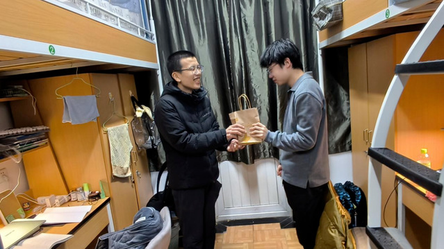 为了表达对学生们的关心,老师们还精心准备了笔记本、水笔等学习用品,作为对学生们的鼓励和支持。这份心意在宿舍的小小空间里流转,师生情谊在互动中愈发深厚。