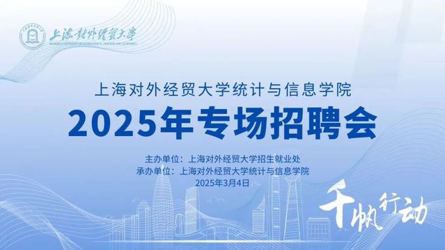 为促进2025届毕业生高质量充分就业,深入推进校企合作交流,上海对外经贸大学统计与信息学院拟于3月4日(周二)下午1:00,在上海对外经贸大学松江校区(松江区文翔路1900号),举行“千帆行动”2025年专场招聘会,包括2025届毕业生就业招聘,以及在校生实习招聘。诚邀各用人单位和广大校友莅临学院,广纳我院优秀人才。