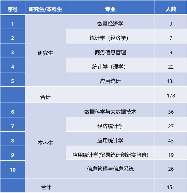 今年,学院2025届毕业生共有330名,其中本科生151名,专业涵盖应用统计学、经济统计学、信息管理与信息系统、数据科学与大数据技术;研究生178名,专业涵盖统计学(理学)、统计学(经济学)、数量经济学、商务信息管理、应用统计(专业学位)。