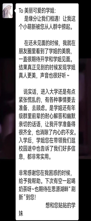 很开心能够和他们相识,在他们身上,我仿佛看到了去年的自己,对大学充满好奇,无比期待即将到来的大学时光。也因此对于他们迫切想了解的东西有着更清晰的认知,真的很高兴能够用我自己过去一年的经历回答他们想要了解的各个方面,让他们对于我们学校的学习和生活有着更清晰的认识。