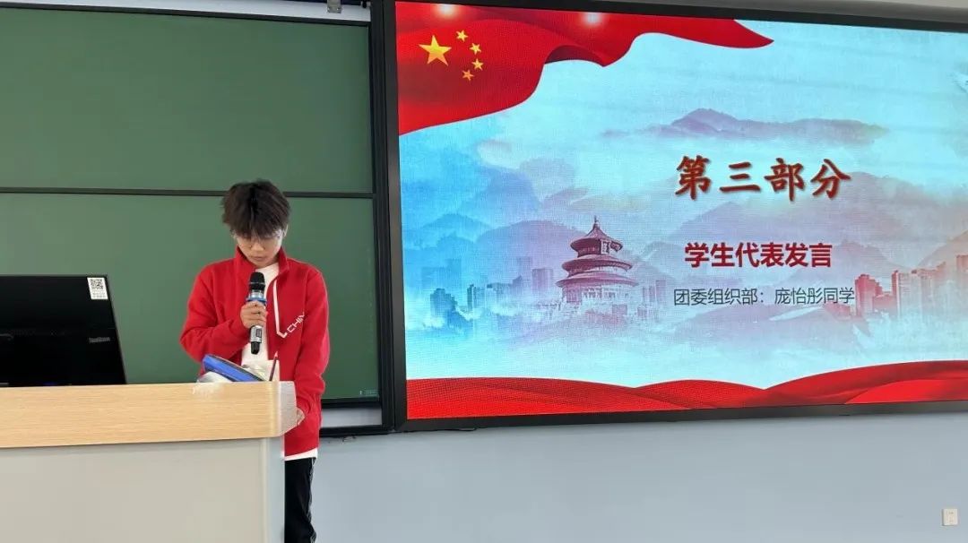 入团申请人代表胡蓬蕾同学发言,她提到,虽然还未加入共青团,但早已心向往之。她表示,在追求学业的同时,也会积极参与集体活动,努力提高组织协调能力,关心国家和社会的发展,将个人价值融入到时代的大潮中去。