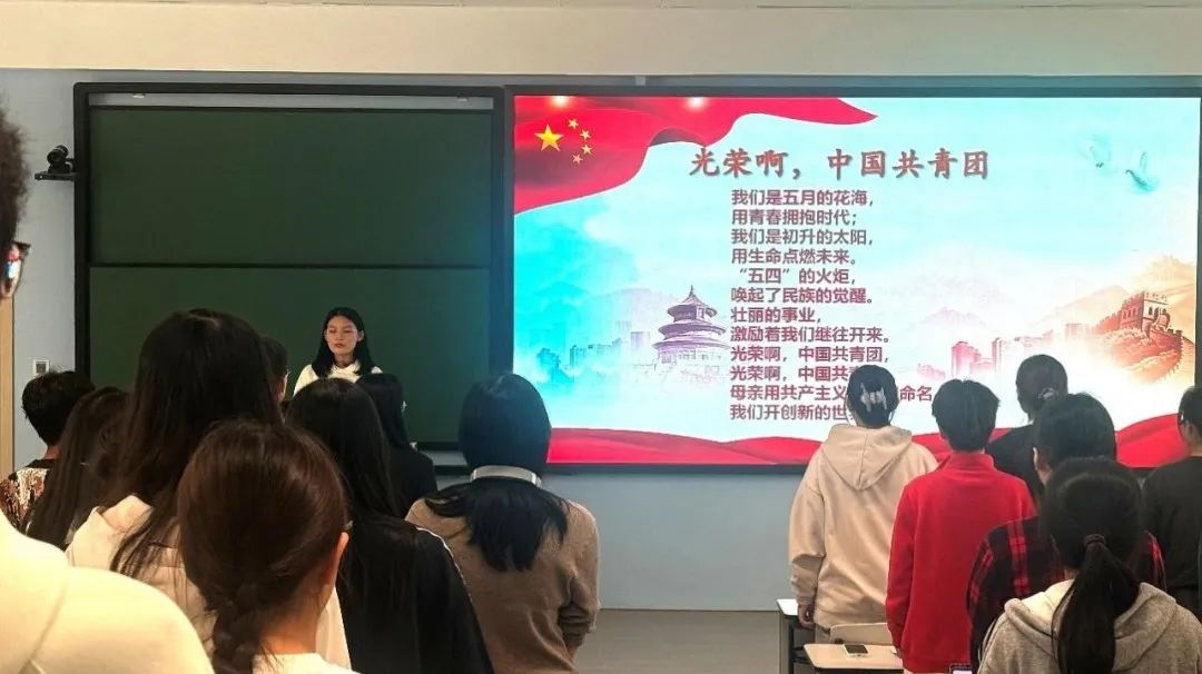 在主持人石蕊婷同学的带领下,全体师生齐唱中国共产主义青年团团歌《光荣啊,中国共青团》,歌声嘹亮,情绪高昂。